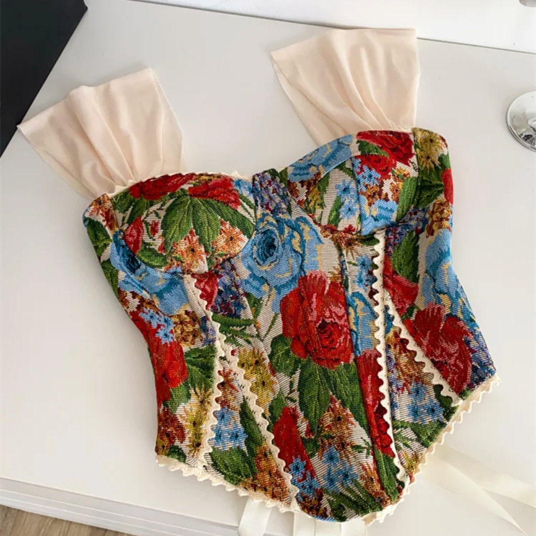Rococo Bloom features a vivid vintage‑inspired floral brocade, sculpted sweetheart cups, and airy chiffon shoulder straps for a romantic, gallery‑girl silhouette. Finished with a lace‑up back and delicate trim, this cropped piece cinches the waist and turns every outfit into a moment.