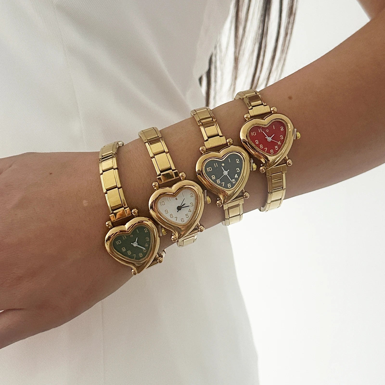 A petite heart‑shaped dial sits on a gold‑tone elastic bracelet for a vintage‑chic stack that slips on in seconds. Smooth, flexible links move with you from day to night.