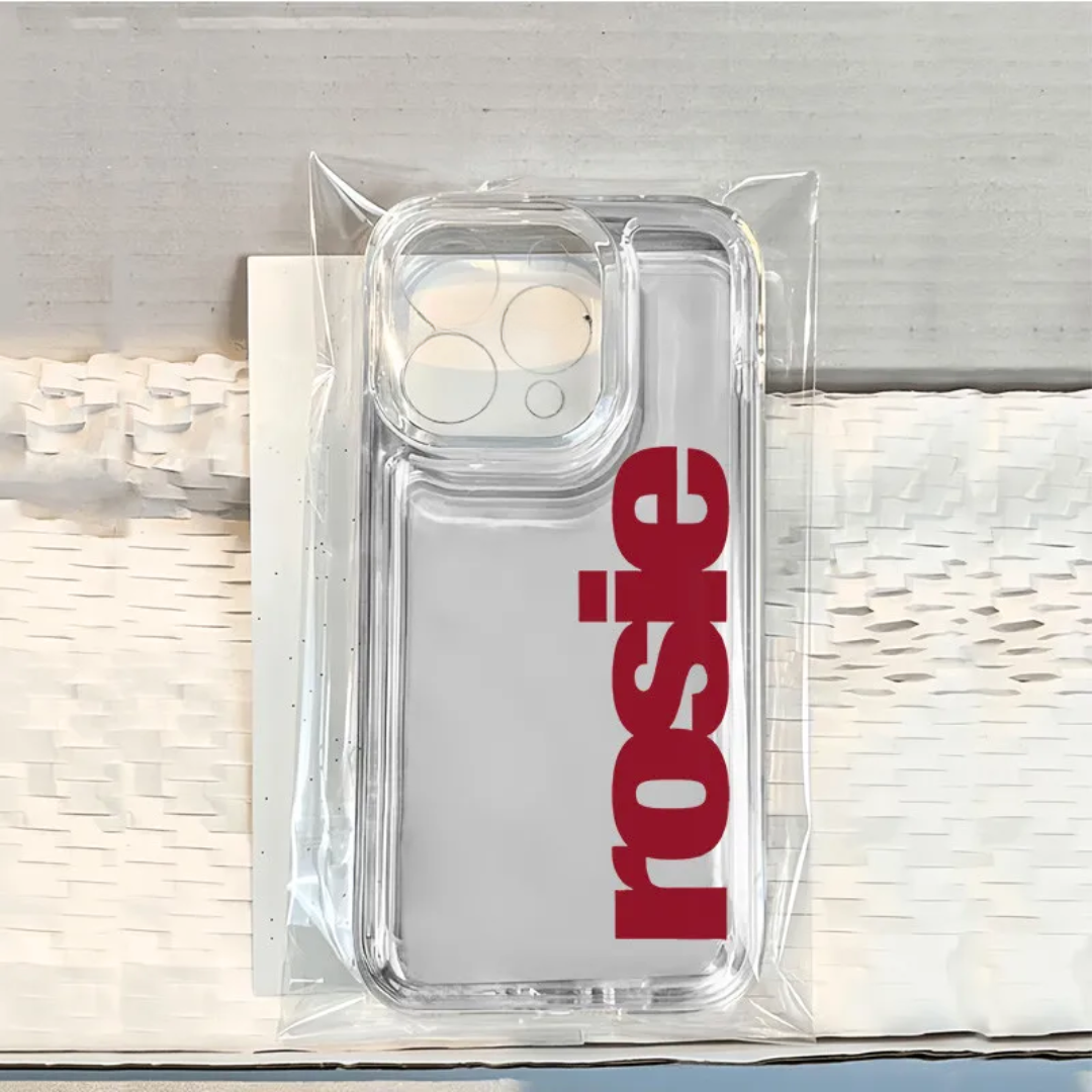 A crystal‑clear acrylic shell shows off your iPhone’s lines while a wine‑red vertical rosie stamp gives it instant street‑studio cred.