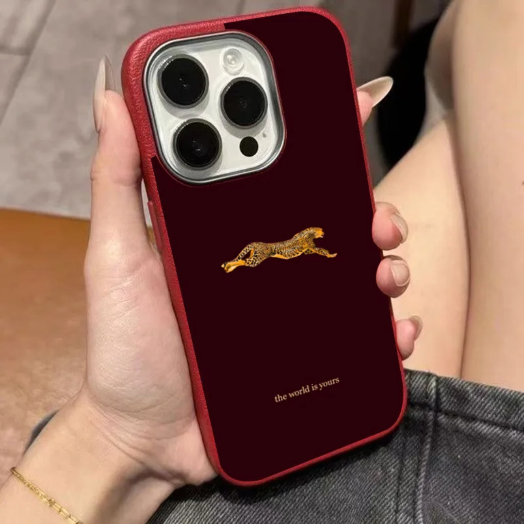Deep wine red paired with a sleek golden panther creates a striking, refined look. Rouge Panther blends business elegance with quiet luxury, giving your phone a bold, modern silhouette that stands out effortlessly.