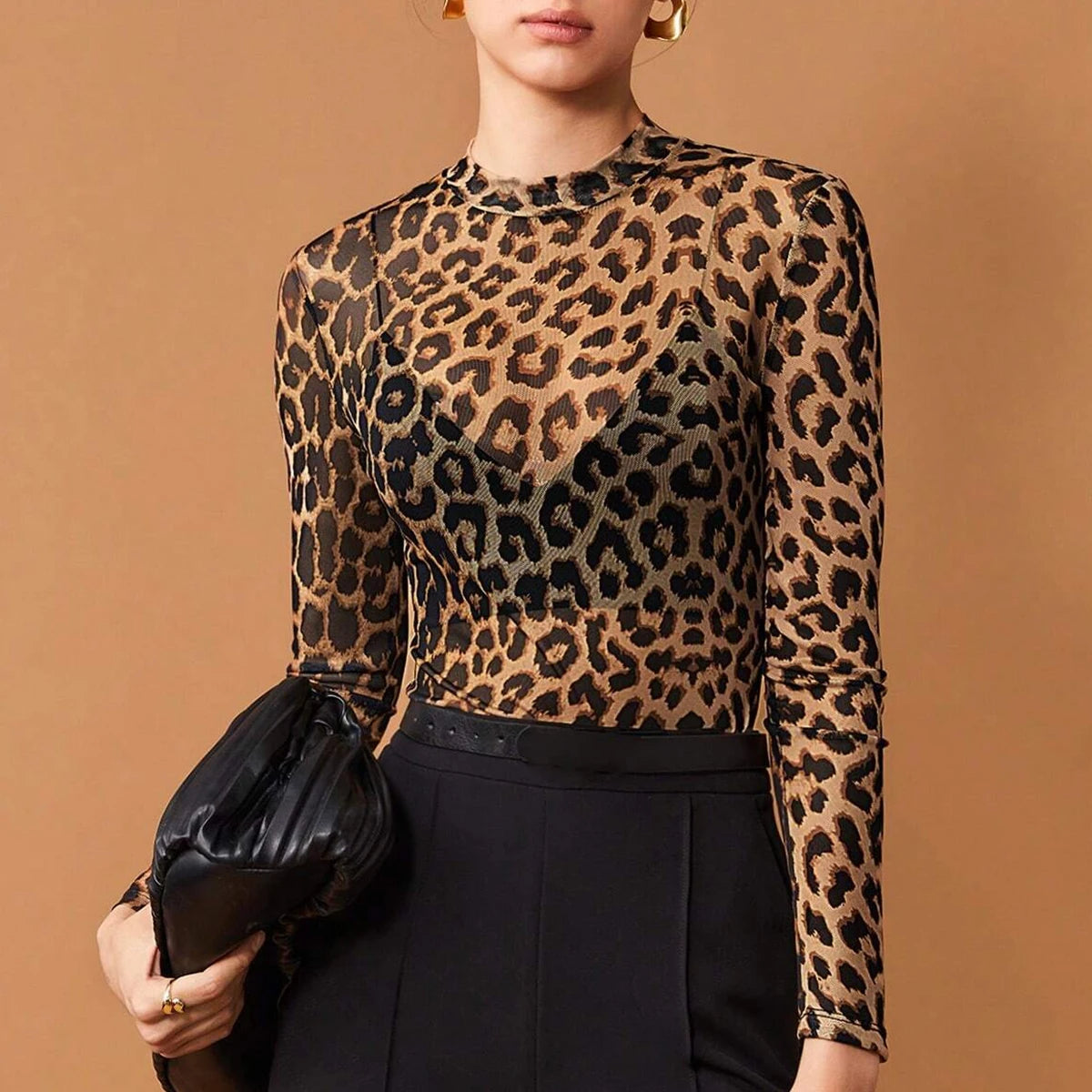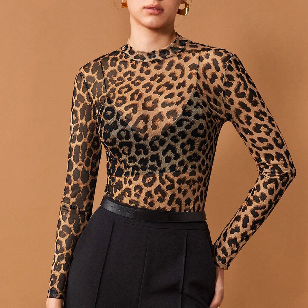 Unleash your inner fierce with this daring, semi-sheer design. Lightweight mesh keeps you cool, and the bold leopard print ensures all eyes are on you. The slim, long-sleeve silhouette and sleek crew neckline add a polished finish.