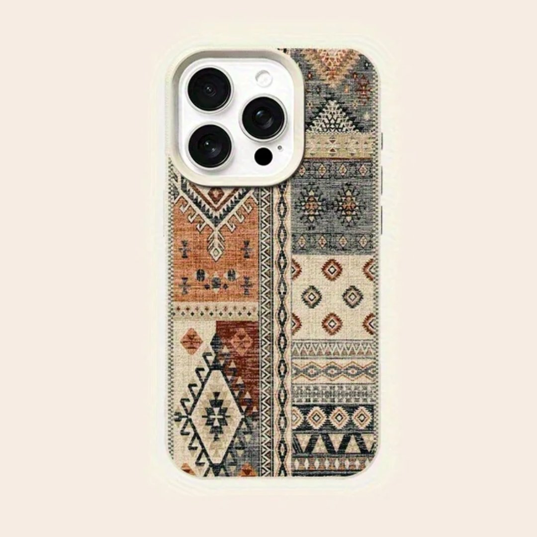 Warm earth tones and crisp geometric bands give this case a vintage tapestry look that feels collected, not trendy. Built on a slim protective shell with shock-absorbing edges for everyday drops and daily wear.