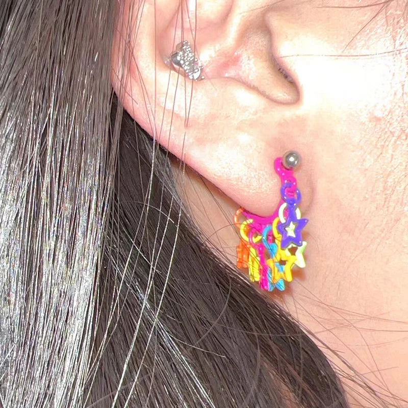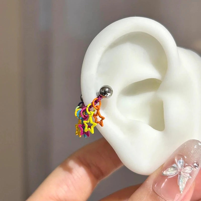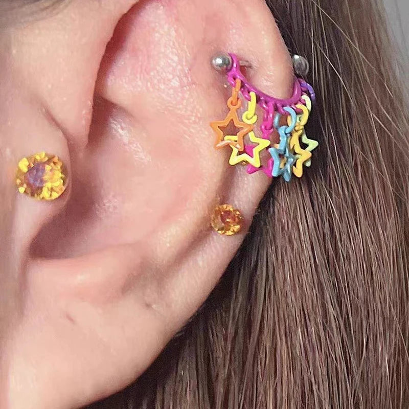 A hinged cartilage huggie trimmed with tiny enamel stars that swing with every turn. Crafted in medical‑grade 316L steel, the cuff hugs the helix securely while staying gentle on sensitive ears.