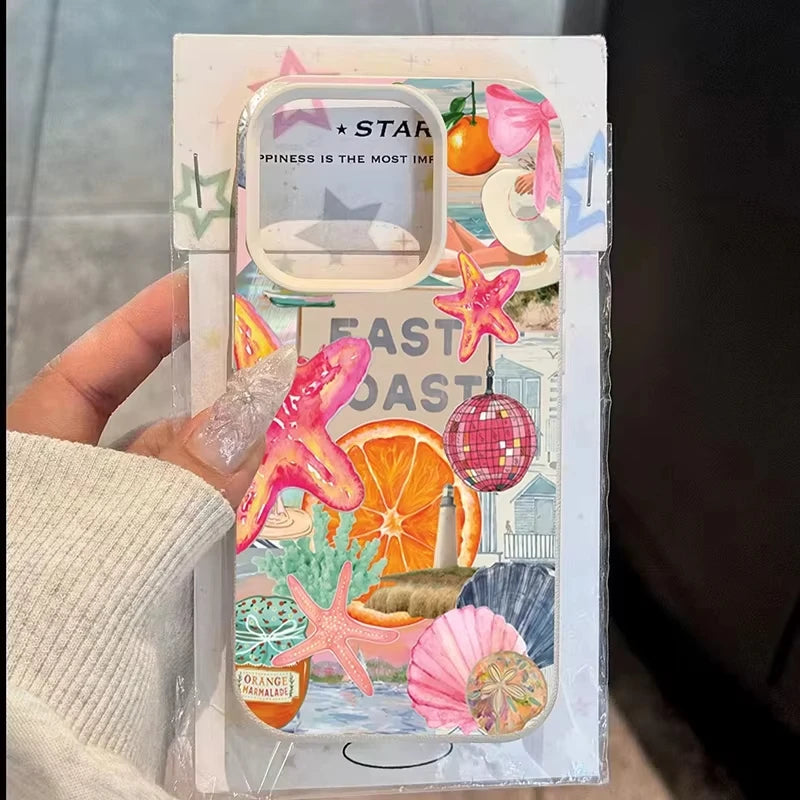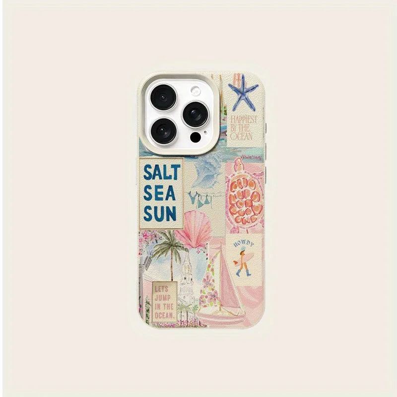 A playful collage of beach postcards, shells, and ocean memories across a soft pastel background. Bright and fun while still protecting your phone.