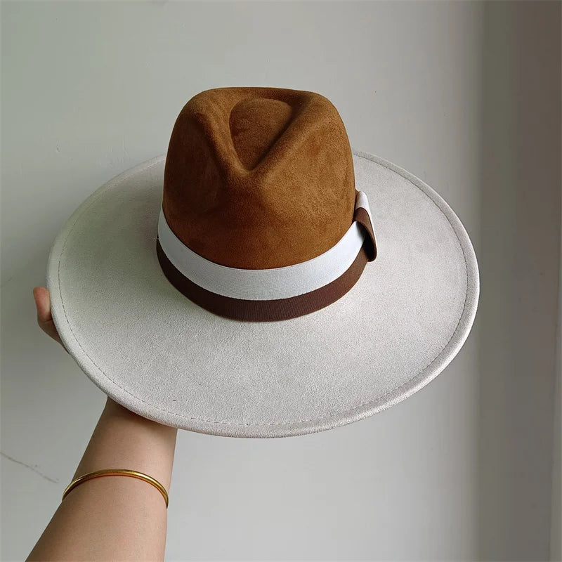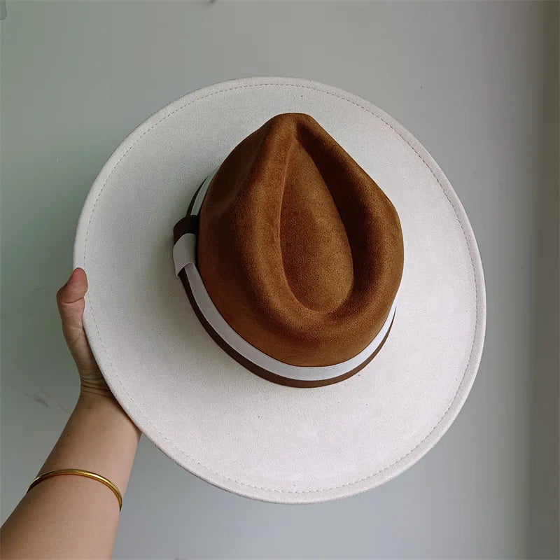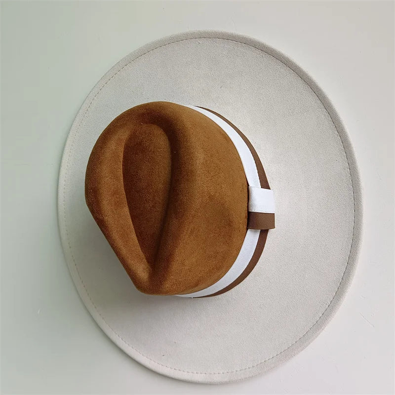 A wide‑brim felt hat cut with a clean color‑block crown and finished in double grosgrain ribbons for a tailored, British‑retro line. The suede‑touch finish and hidden adjuster deliver a custom fit that elevates trenches, knits and coats alike.