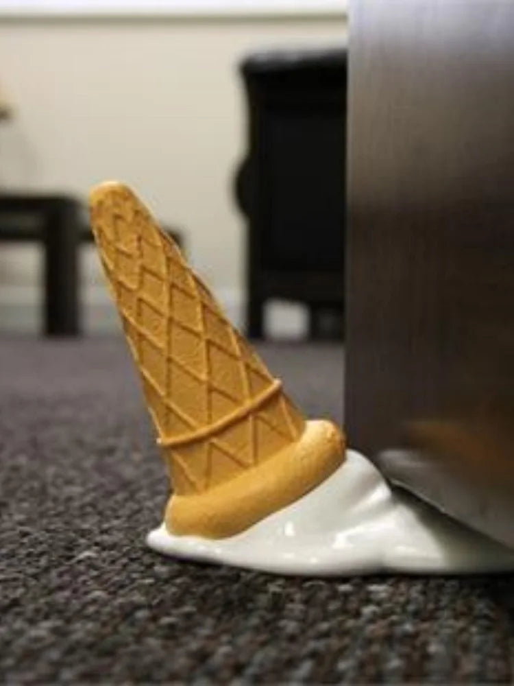 Crafted with meticulous attention to detail, the Scoops of Whimsy Doorstop features a textured waffle cone base in a warm, inviting tan hue. The "ice cream" portion is designed to be soft and pliable, allowing it to wedge securely under your door to keep it propped open with ease.