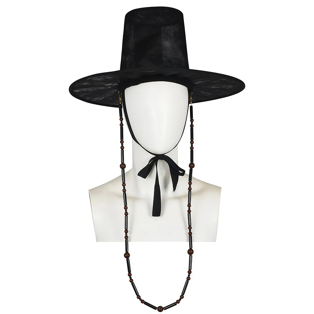 A faithful nod to classic Korean costume, reimagined for stages, shoots and festivals. This lightweight, sheer‑mesh gat frames the face with a tall crown and wide brim, while beaded side cords and a ribbon chin tie add dramatic movement and a secure fit.