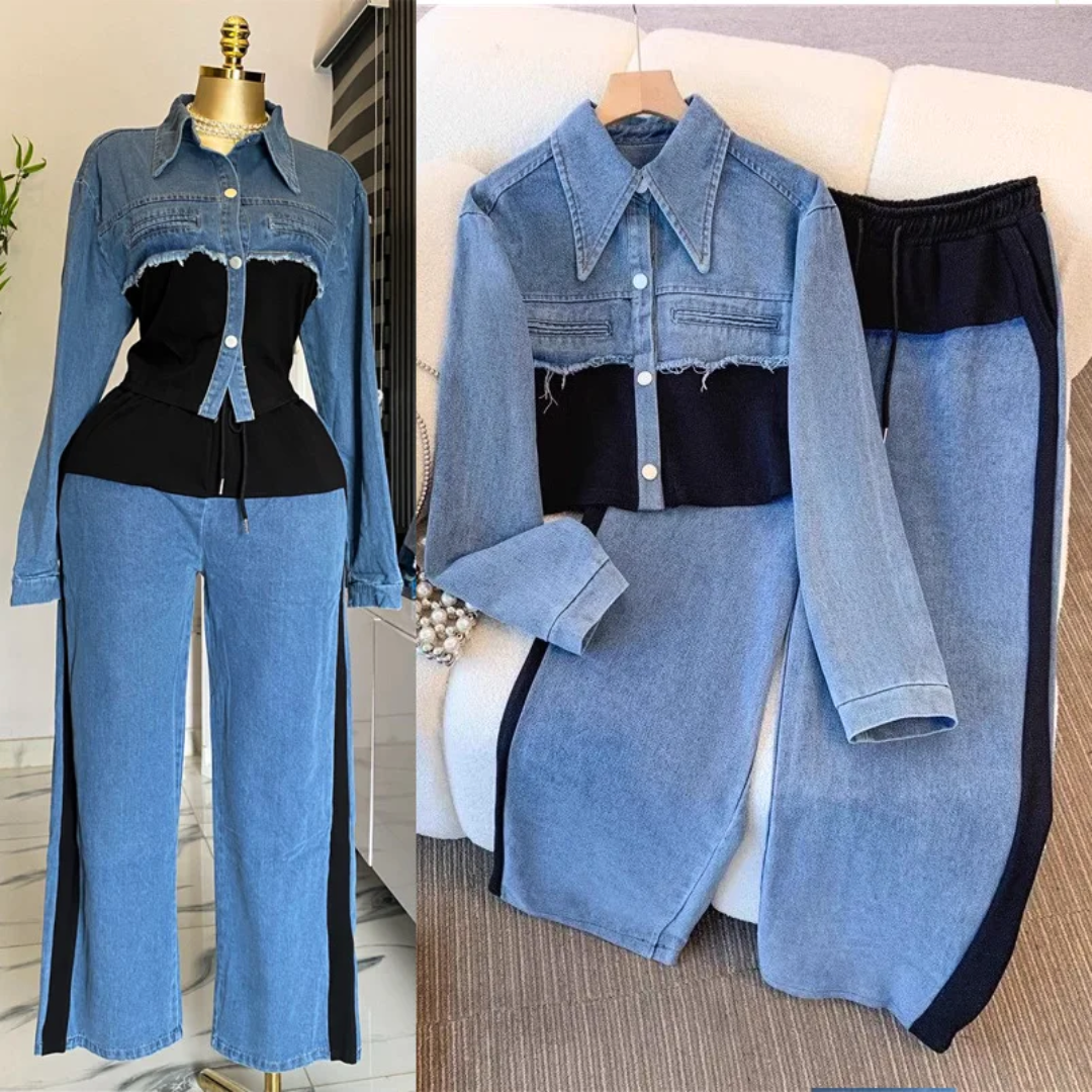 A refined splice of indigo hues highlights the tailored button-up top, while wide-leg pants bring graceful movement and effortless flair. A lace-up detail cinches the waist, uniting comfort with runway-ready confidence for a statement that commands attention day or night.