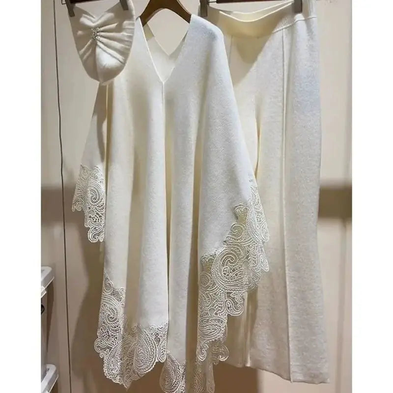 This luxurious ensemble is crafted from a blend of soft wool and delicate lace, designed to keep you warm and stylish all season long. The feeling of the plush knit against your skin, the intricate lace detailing adds a touch of romance, and the flowing silhouette.