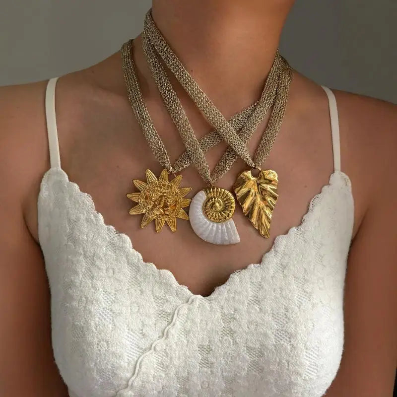 Fluid stainless‑mesh ribbons drape the neck, each anchoring a sculptural pendant—gilded sunburst, palm leaf, or pearlescent resin conch—so luminous they read like heirlooms on camera. Wear one for quiet glow or stack all three for a Riviera‑runway statement that hijacks every feed.