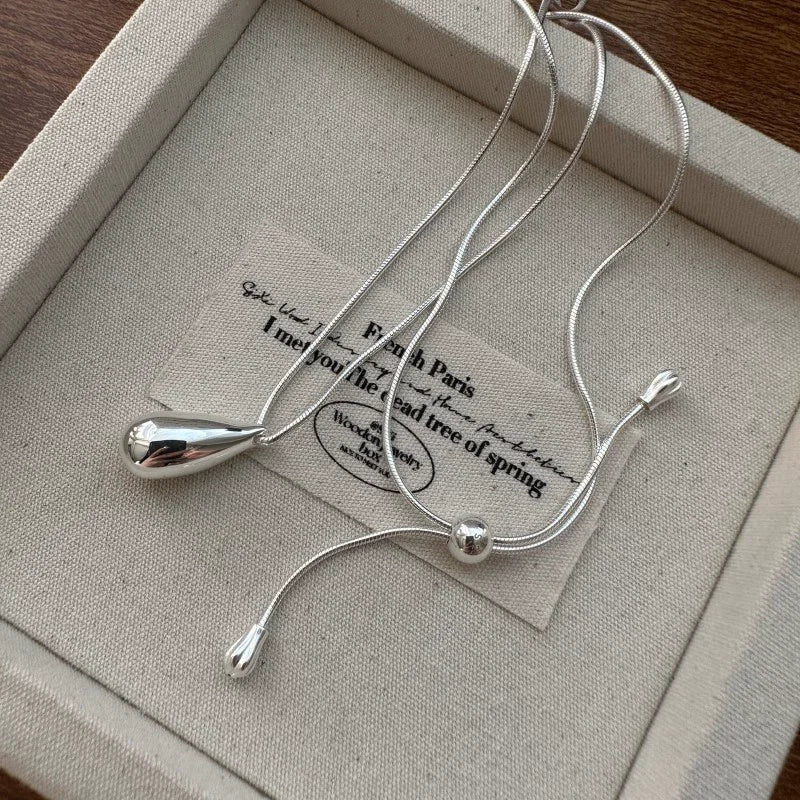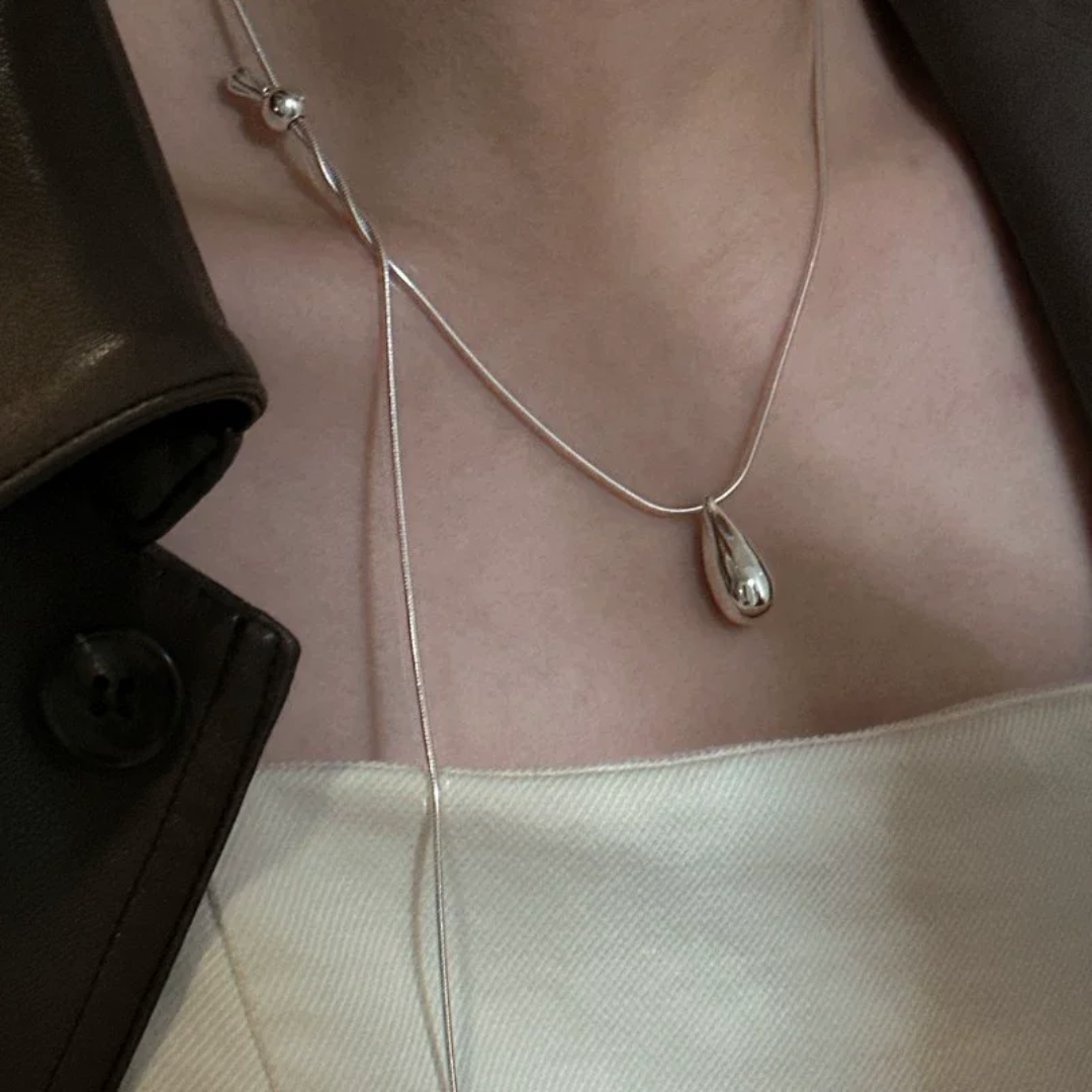 A mirror-polished sterling teardrop hangs from a fluid snake chain, catching and reflecting light like a tiny drop of liquid metal at your collarbone. The chain glides smoothly against fabric and skin, giving a minimal, elegant finish that works with everything from a white tee to a slip dress.