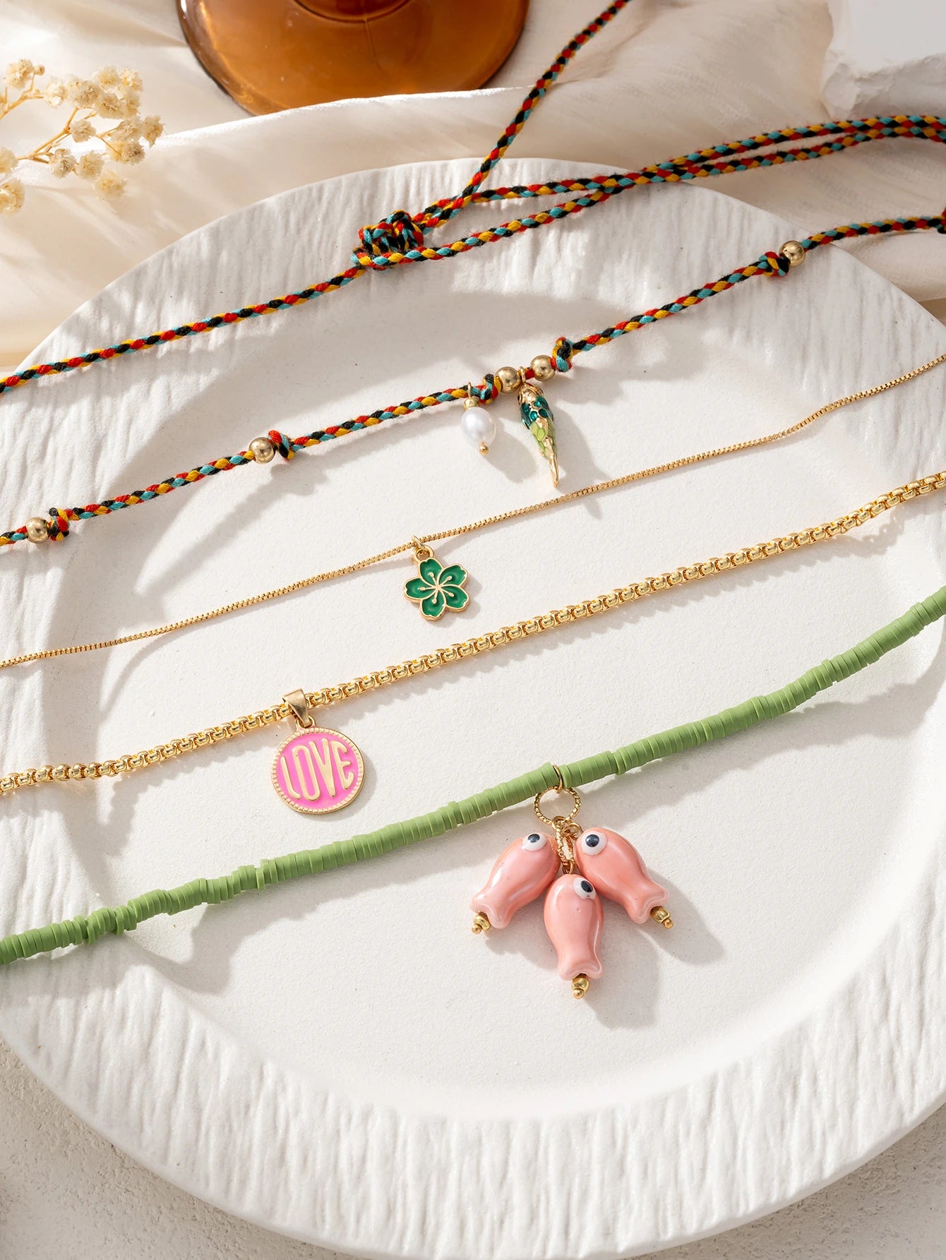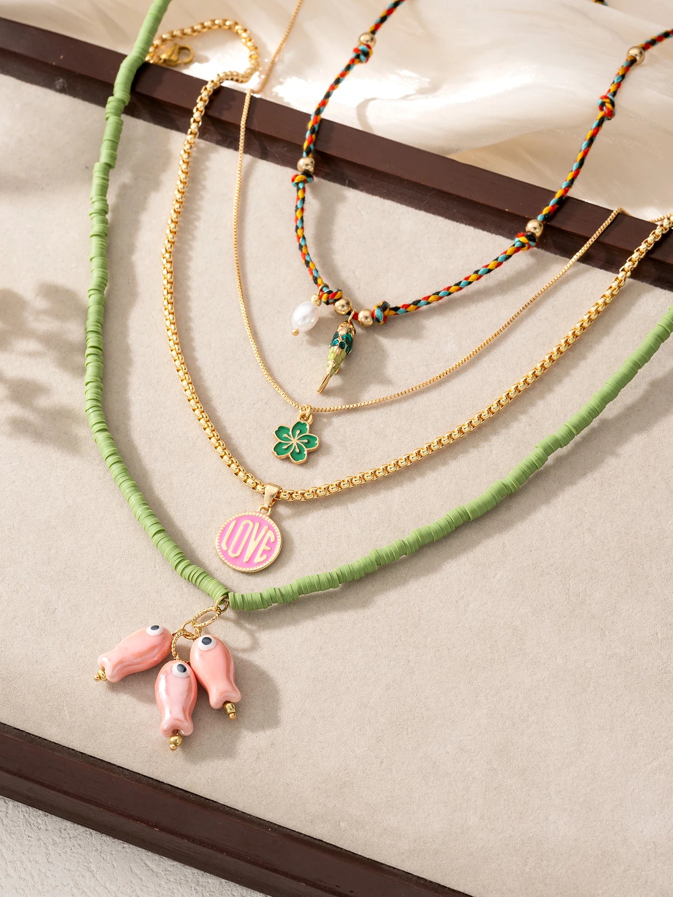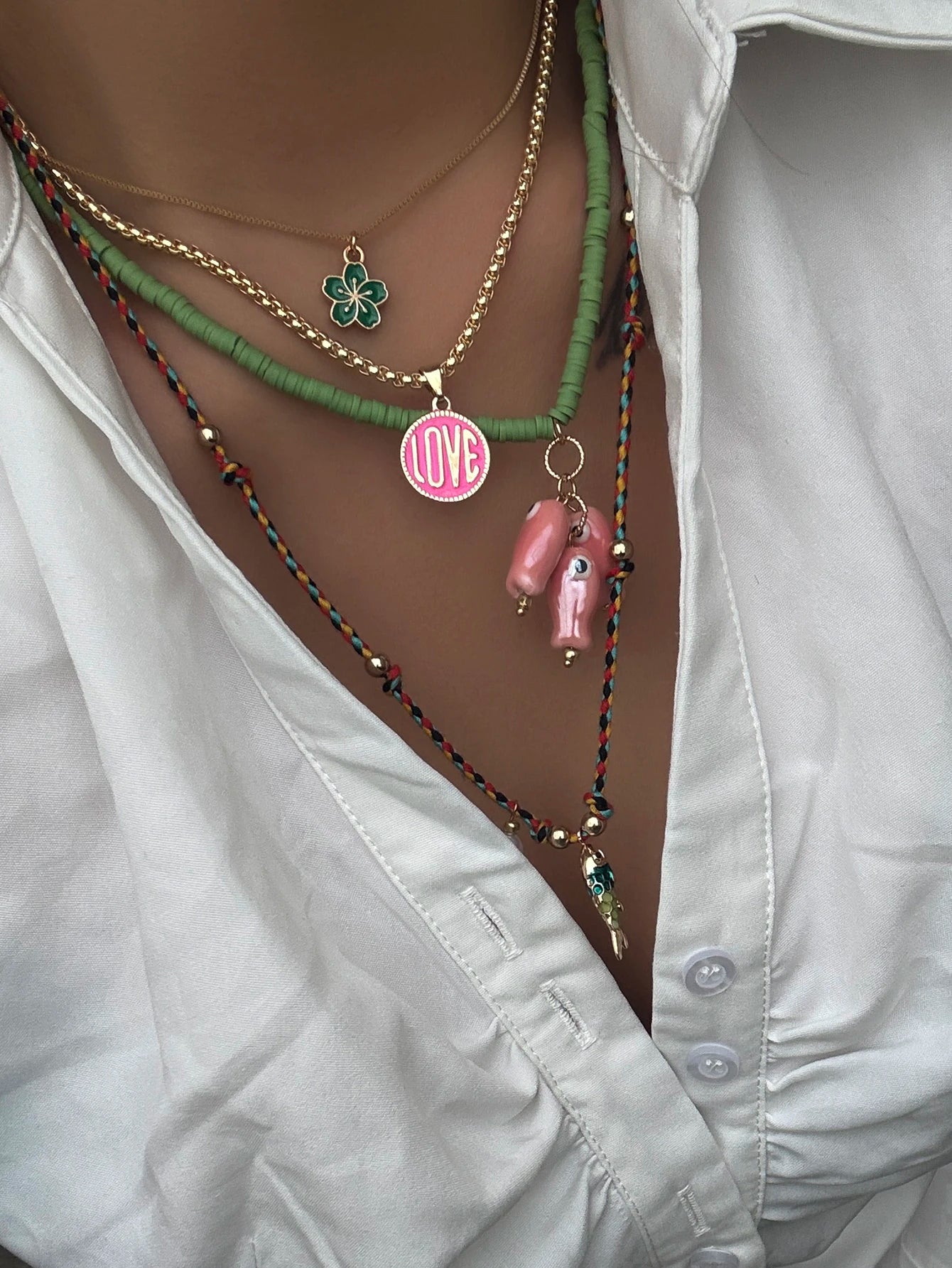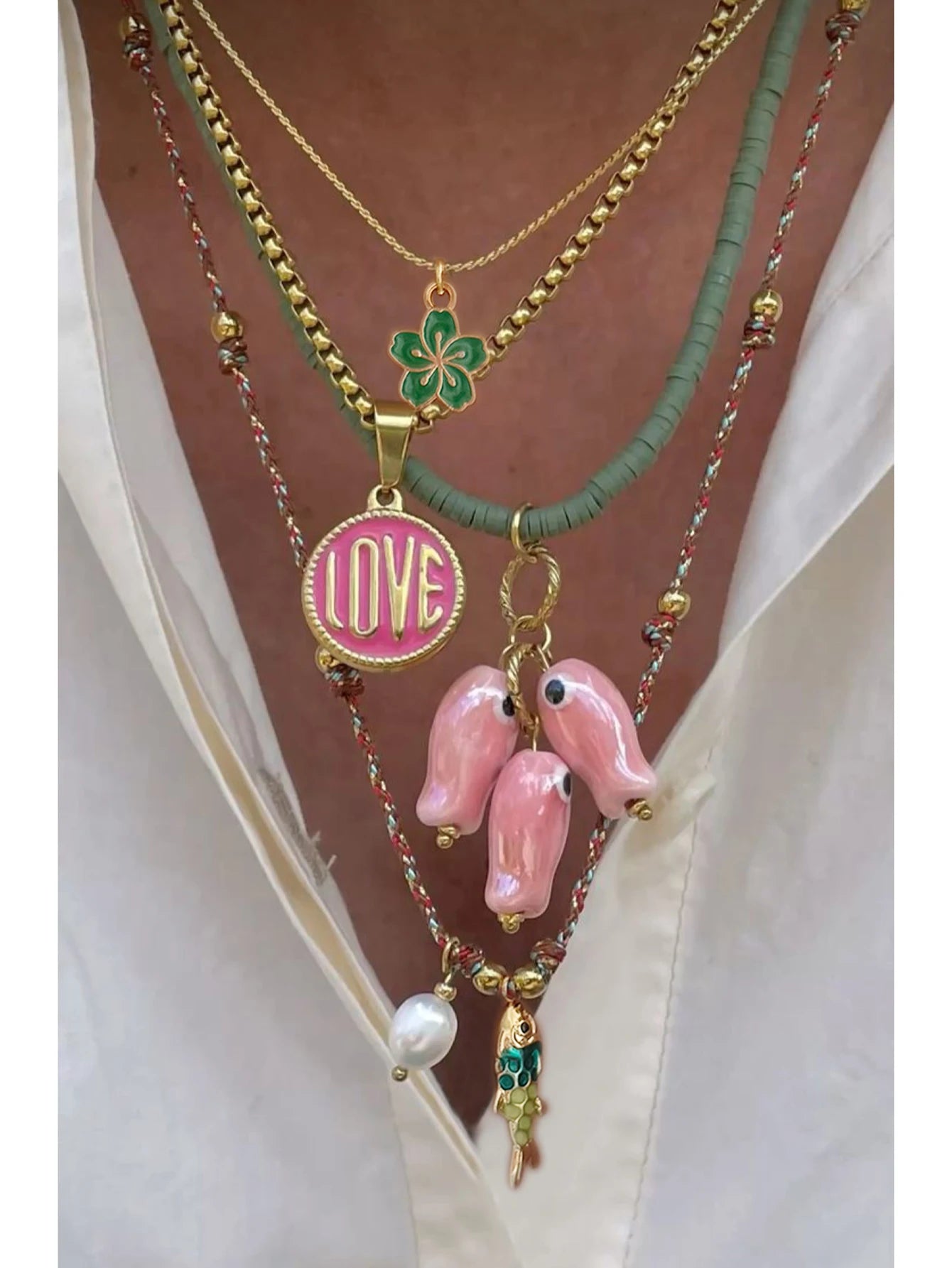 Color, shine, and charm—four separate strands layer into an effortless statement featuring enamel tokens, ceramic beads, and playful fish pendants. Wear one or stack all for a vacation‑ready neckline in seconds.