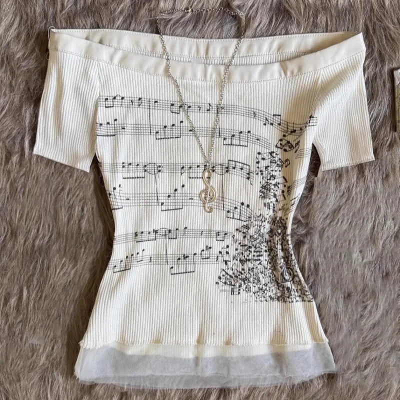 Cut from soft ribbed jersey with generous stretch, this fitted off‑shoulder tee is printed with a vintage‑style musical score and finished with a sheer mesh hem that skims the waist.