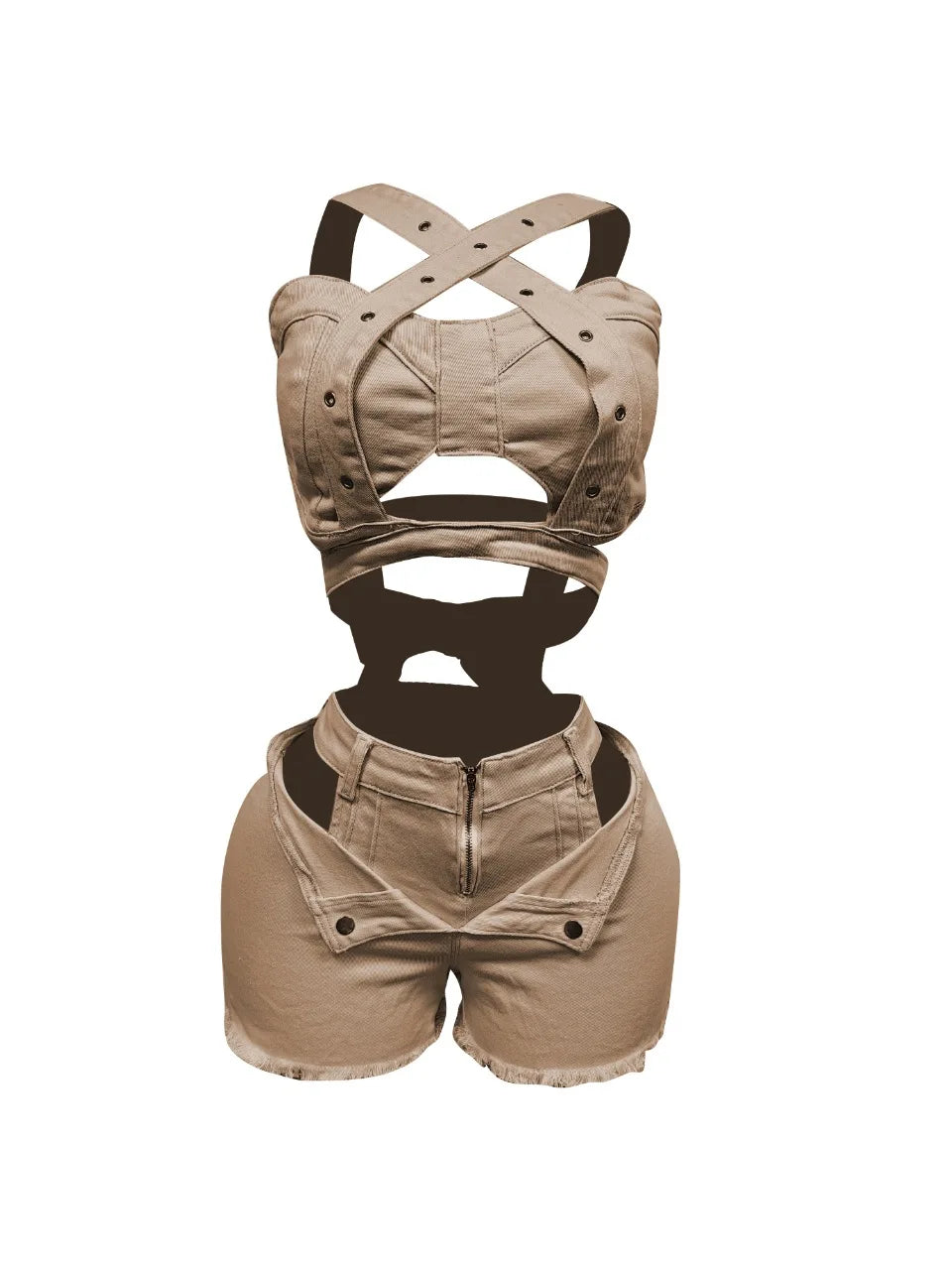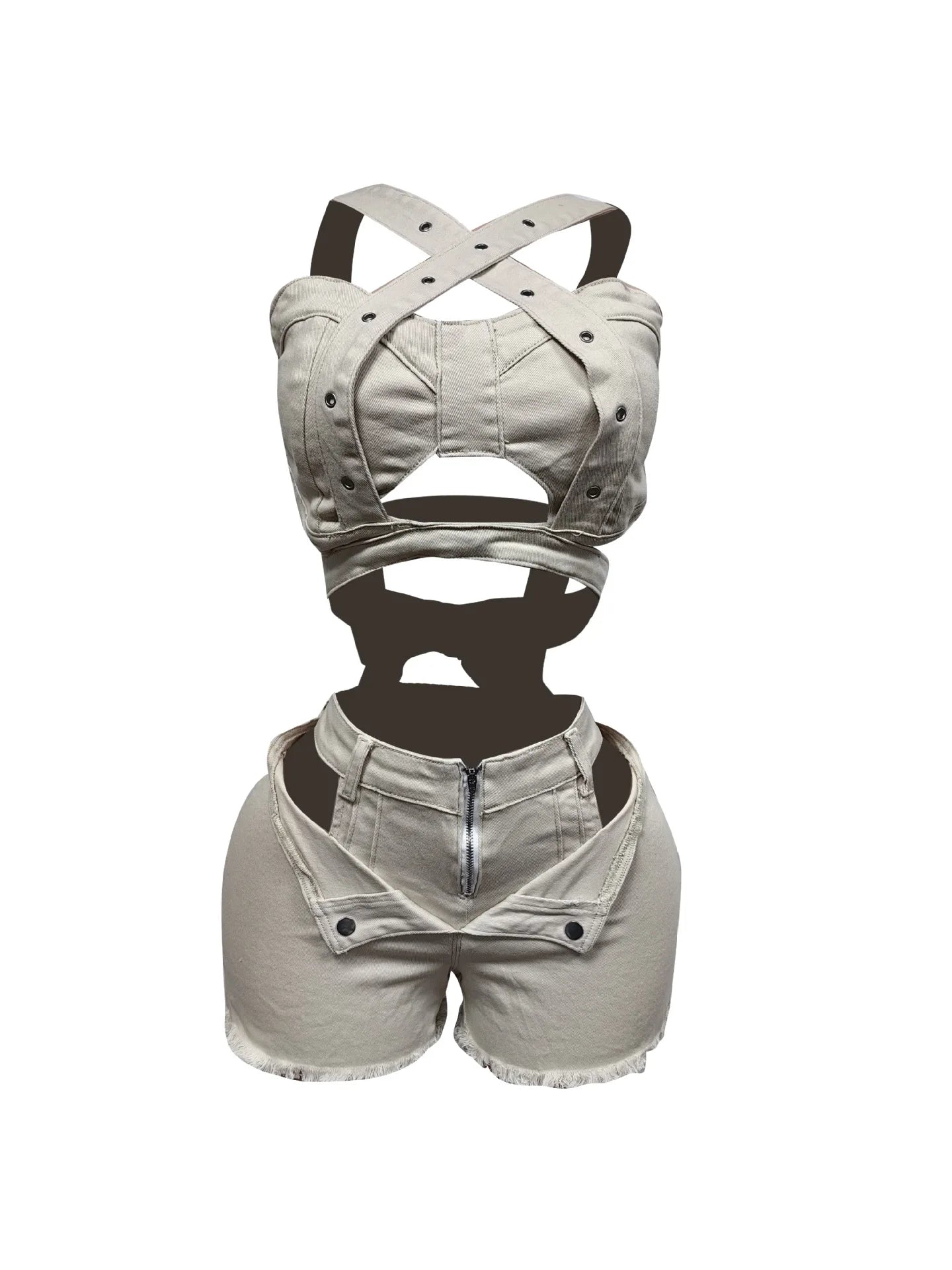 Architected from soft stretch denim, the halter crop laces the torso with sculpted cut‑outs while high‑rise fray‑hem shorts lift and contour from every angle. Finished with matte gunmetal hardware, the two‑piece serves runway attitude packed small enough for a carry‑on weekend.