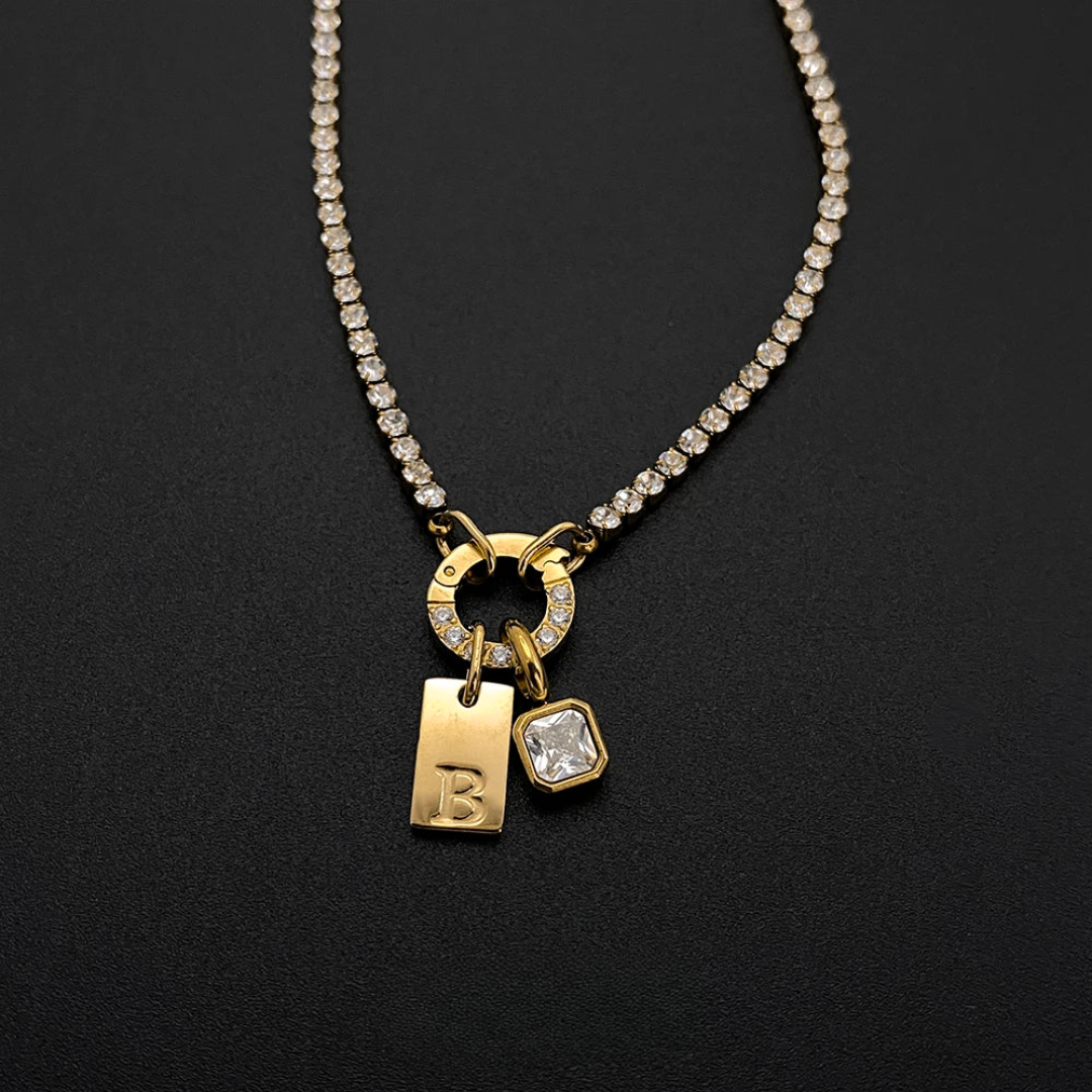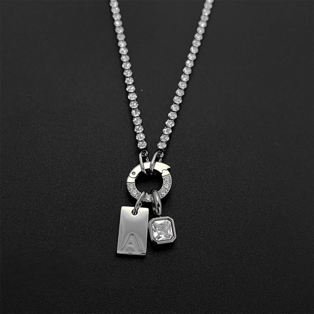 Starling Forge pairs a light‑catching tennis chain with a personal touch. Crafted from stainless steel, it suspends a polished initial tag and a cushion‑cut zircon from a small ring at the collarbone. Choose your letter and wear it solo or layered.