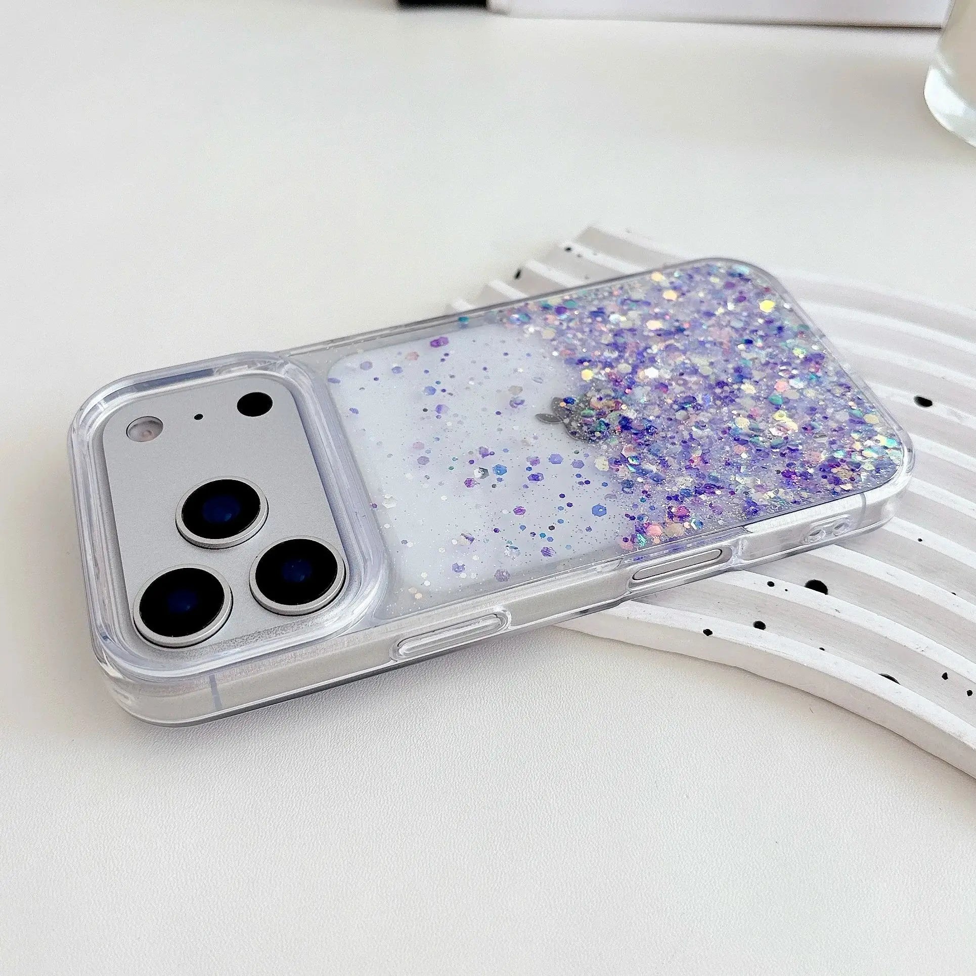 Iridescent sequins float inside a crystal-clear gel panel, drifting in slow, relaxing waves every time you tilt your phone. Charged by daylight, the sequins release a soft glow after dark, making your phone shimmer at night while the transparent shock frame keeps the original color visible and protected.