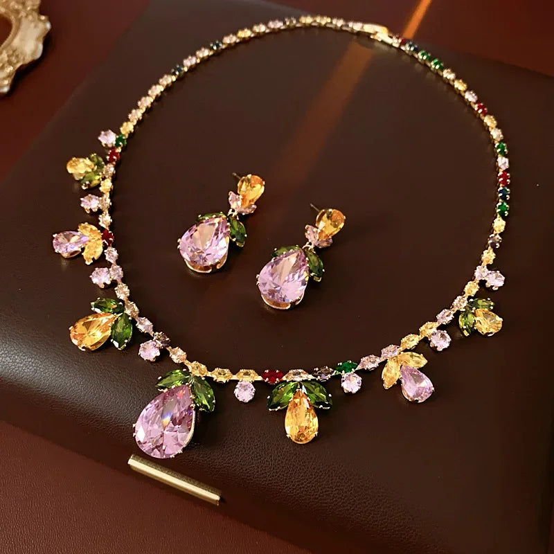 Each teardrop gem shimmers with mesmerizing brilliance, framed by delicately sculpted leaf accents. Designed to captivate at weddings, galas, or any special occasion, this set embodies modern glamour with a timeless twist.