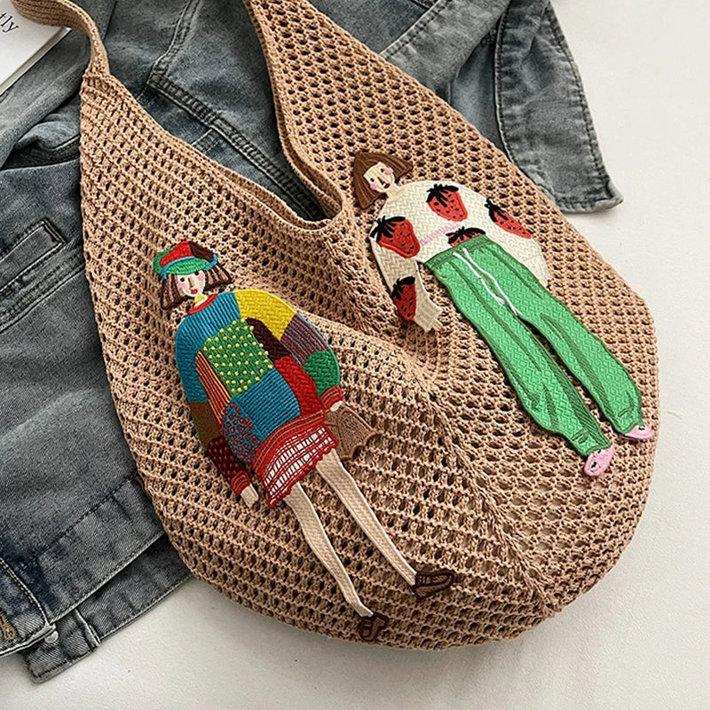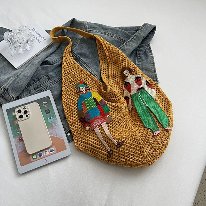 Hand‑knotted cotton mesh meets vivid, hand‑stitched character patches for a tote that feels like wearable folk art. The teardrop silhouette drapes comfortably under your arm while holding beach‑day essentials or daily commute gear.