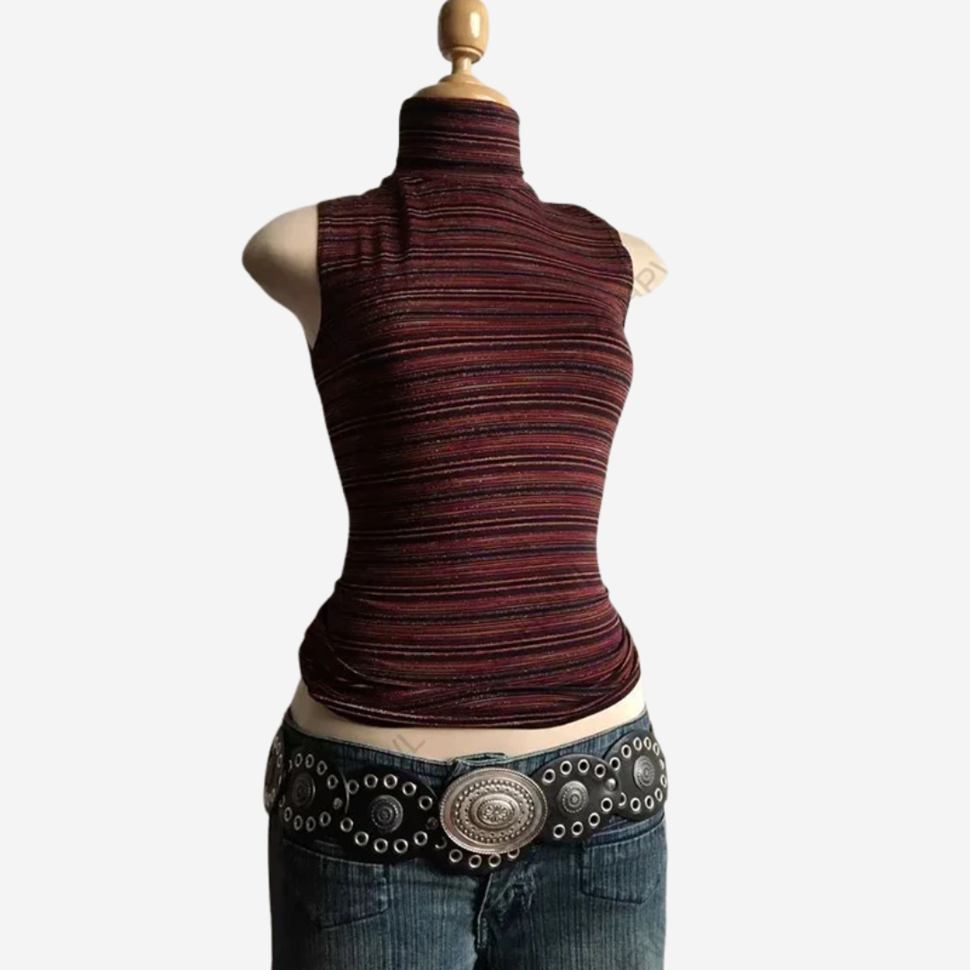 Strata wraps your frame in inky wine‑and‑charcoal micro‑stripes, cut in a sleek mock‑neck silhouette that feels very Y2K, very now. The longline, body‑skimming fit creates clean lines from collar to hem—perfect solo with denim or layered under a jacket for late‑night city runs.