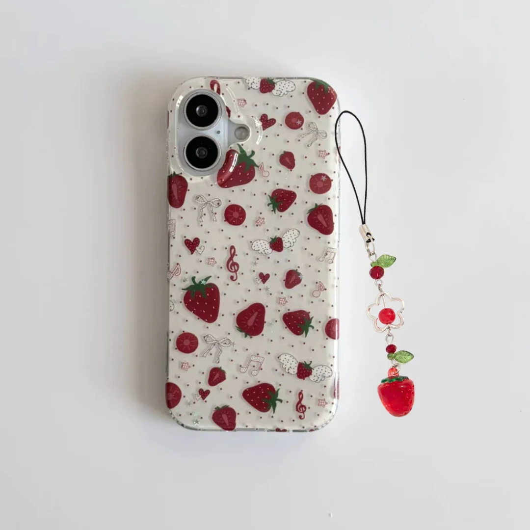 Fresh, playful, and effortlessly cute. The Strawberry Charm Phone Case features a soft strawberry pattern with a matching charm strap for the perfect aesthetic touch.