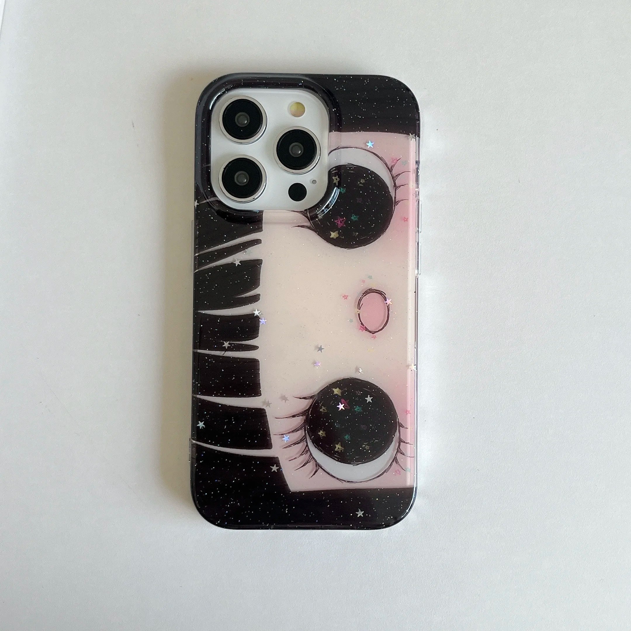 Starry‑Eyed frames your phone with a glossy anime‑inspired face—oversized glitter pupils, soft blush, and inky lashes—sealed in a sparkled clear coat. A slim shock‑absorb bumper and raised camera lip keep the dreamy look pristine while you snap, scroll, and glow.
