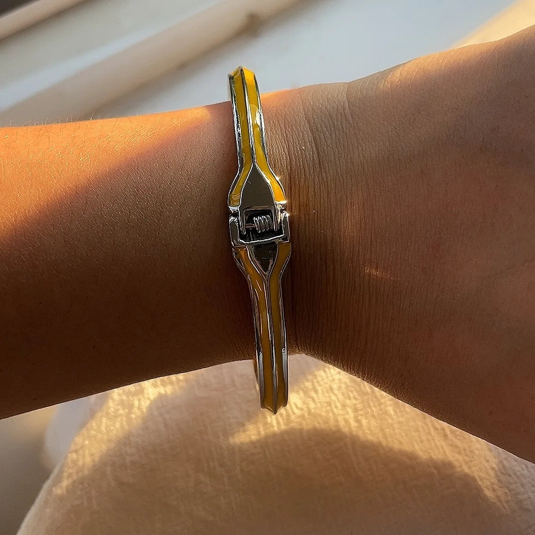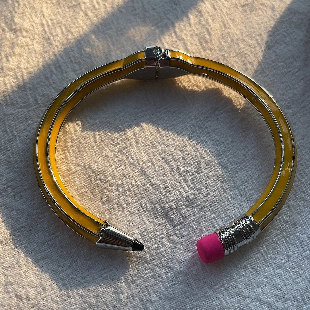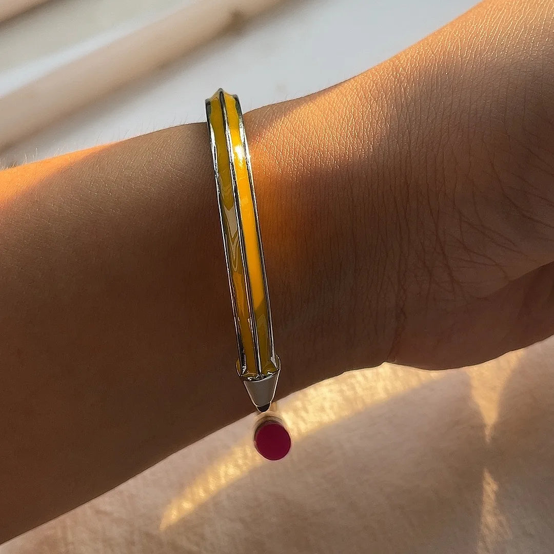 A clever nod to the classic No. 2, this handmade open cuff wraps the wrist in sunny yellow with polished pencil‑cap ends and a rosy eraser tip. Light, adjustable, and made for stacking, it’s the cheeky back‑to‑school gift teachers, grads, and stationery lovers wear all year.