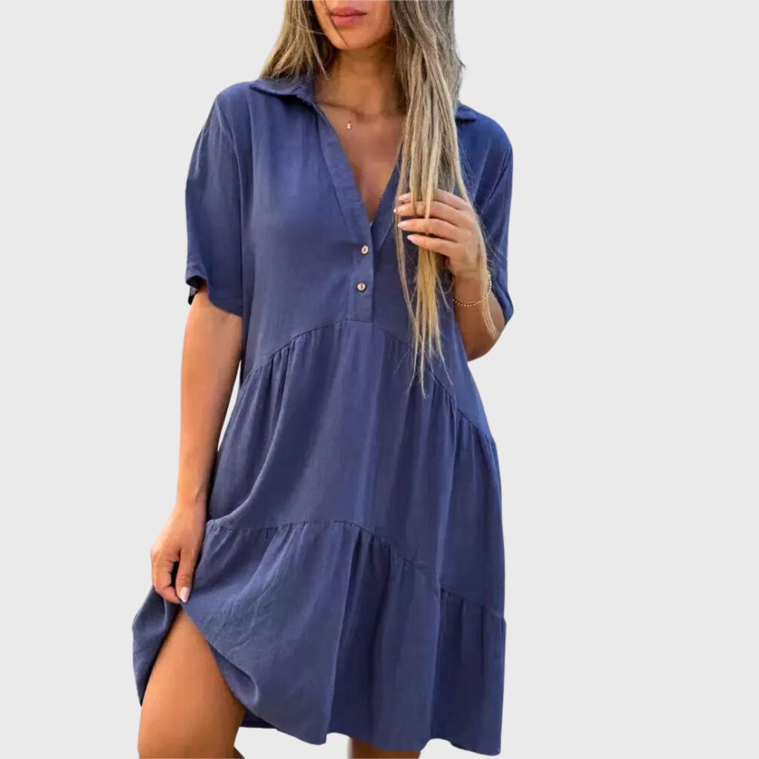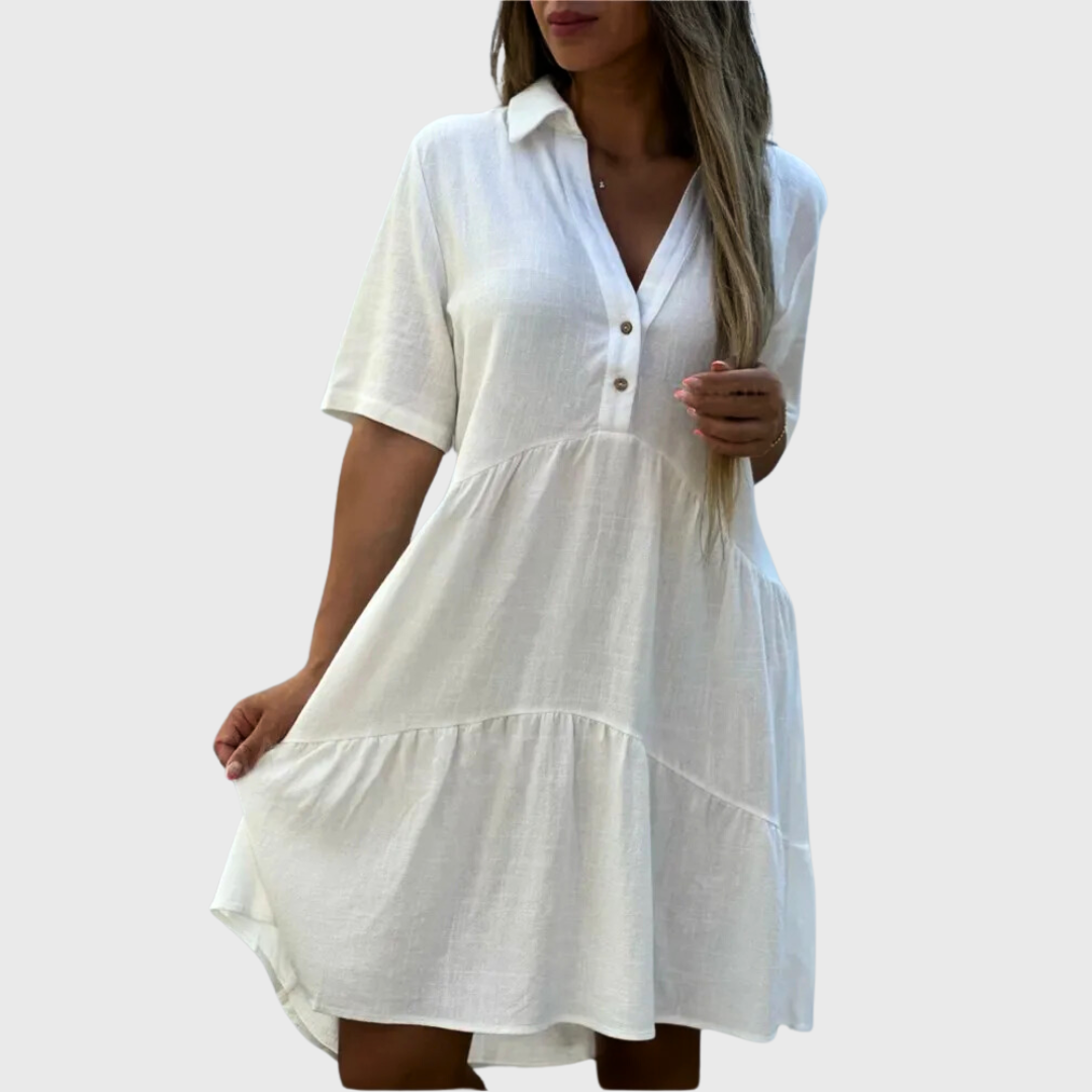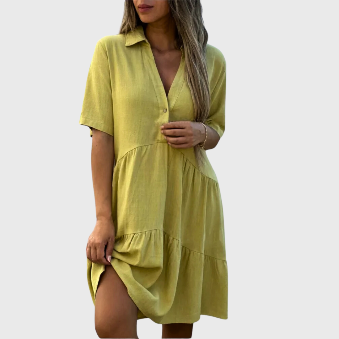 Crafted from a lightweight cotton-linen blend, this dress offers the perfect balance of comfort and chic. Its relaxed fit, short sleeves, and V-neckline create a flattering silhouette that effortlessly transitions from beach days to city nights.