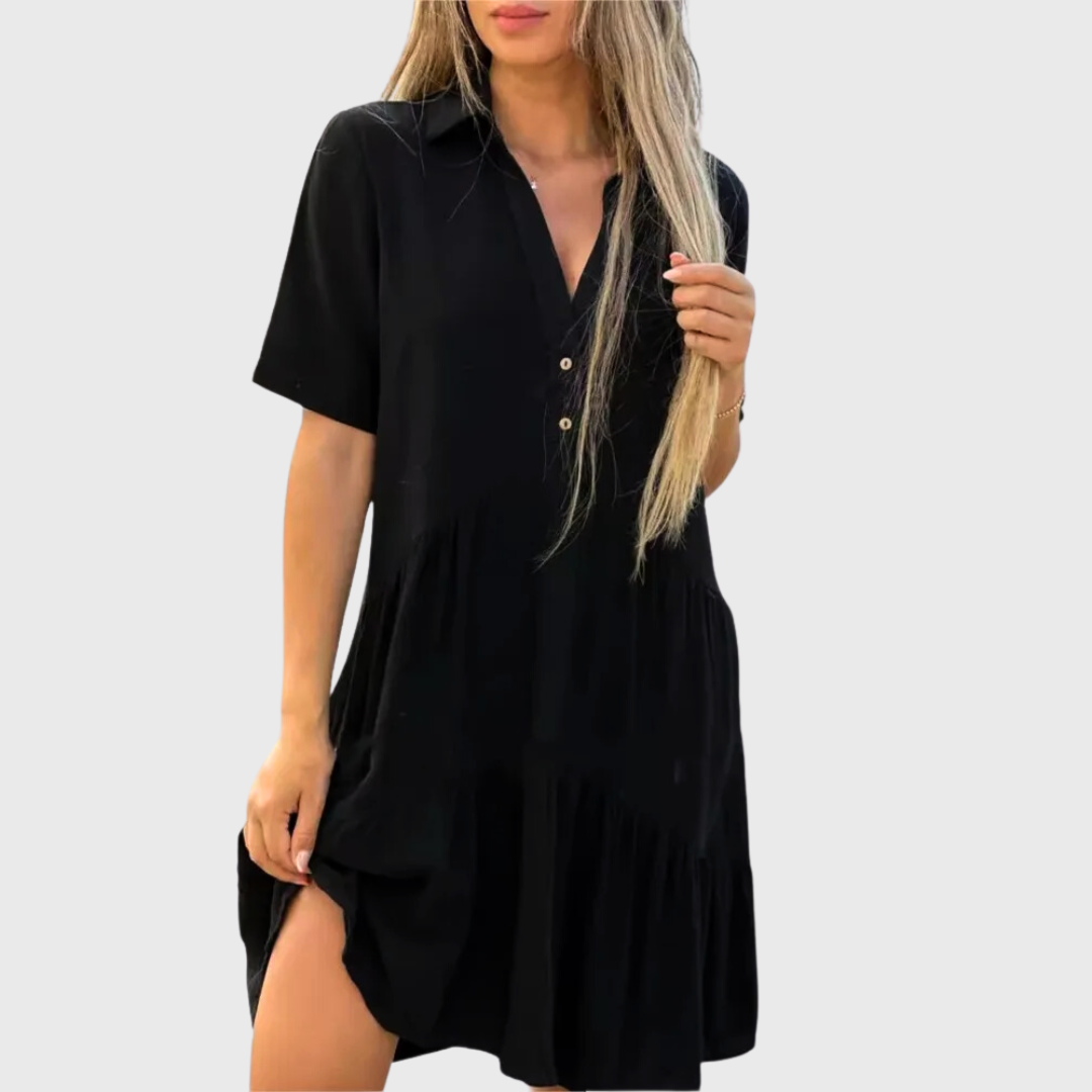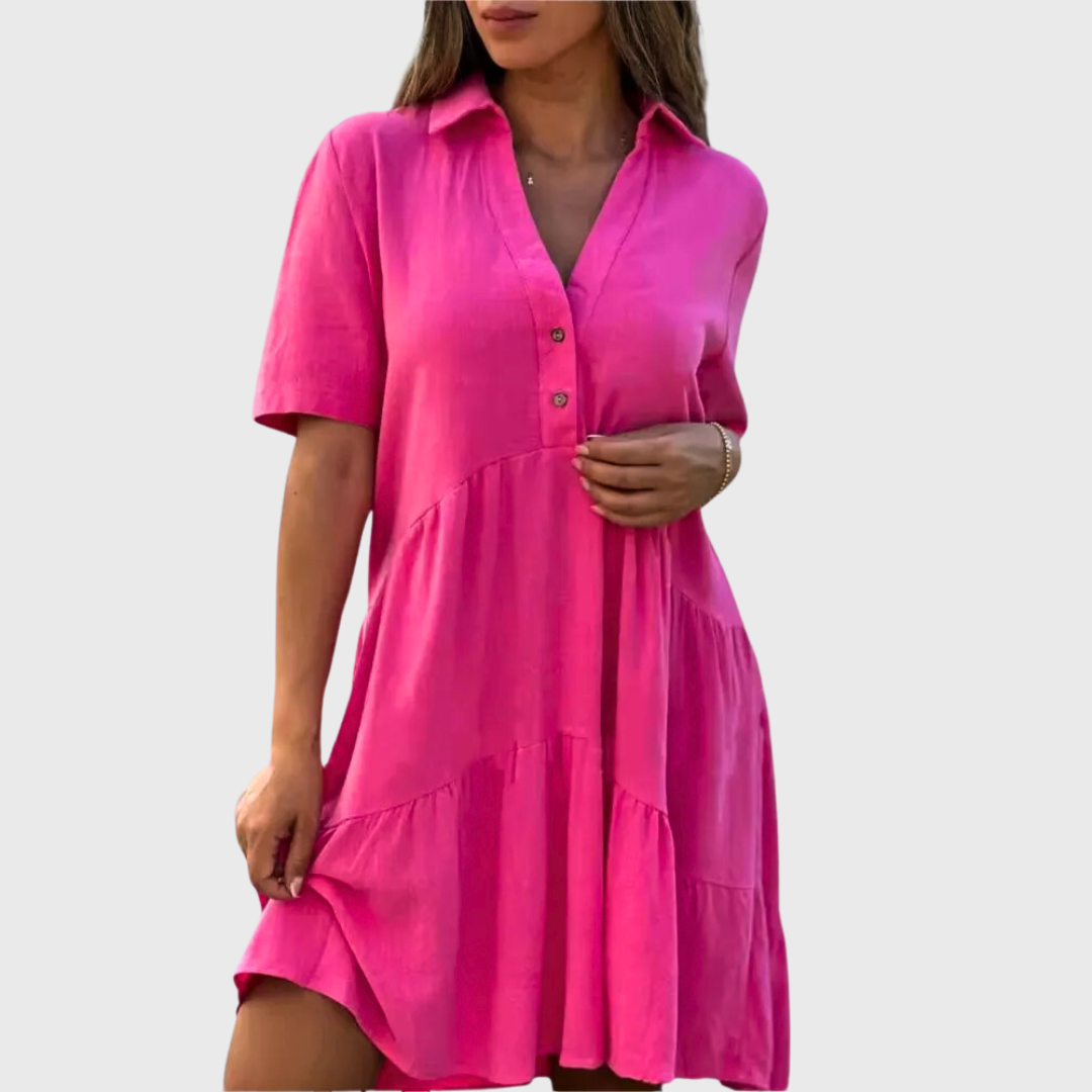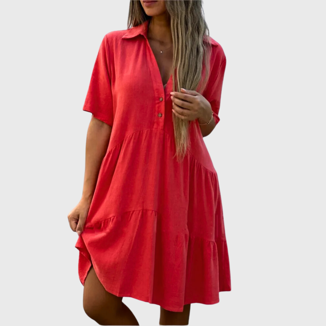 Crafted from a lightweight cotton-linen blend, this dress offers the perfect balance of comfort and chic. Its relaxed fit, short sleeves, and V-neckline create a flattering silhouette that effortlessly transitions from beach days to city nights.