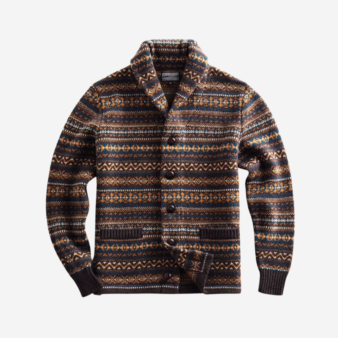 The garment features a classic chambray fabric that lends it a timeless, versatile look. The subtle texture and heathered appearance of the material elevate the cardigan from a simple layering piece to a garment that can confidently stand alone.