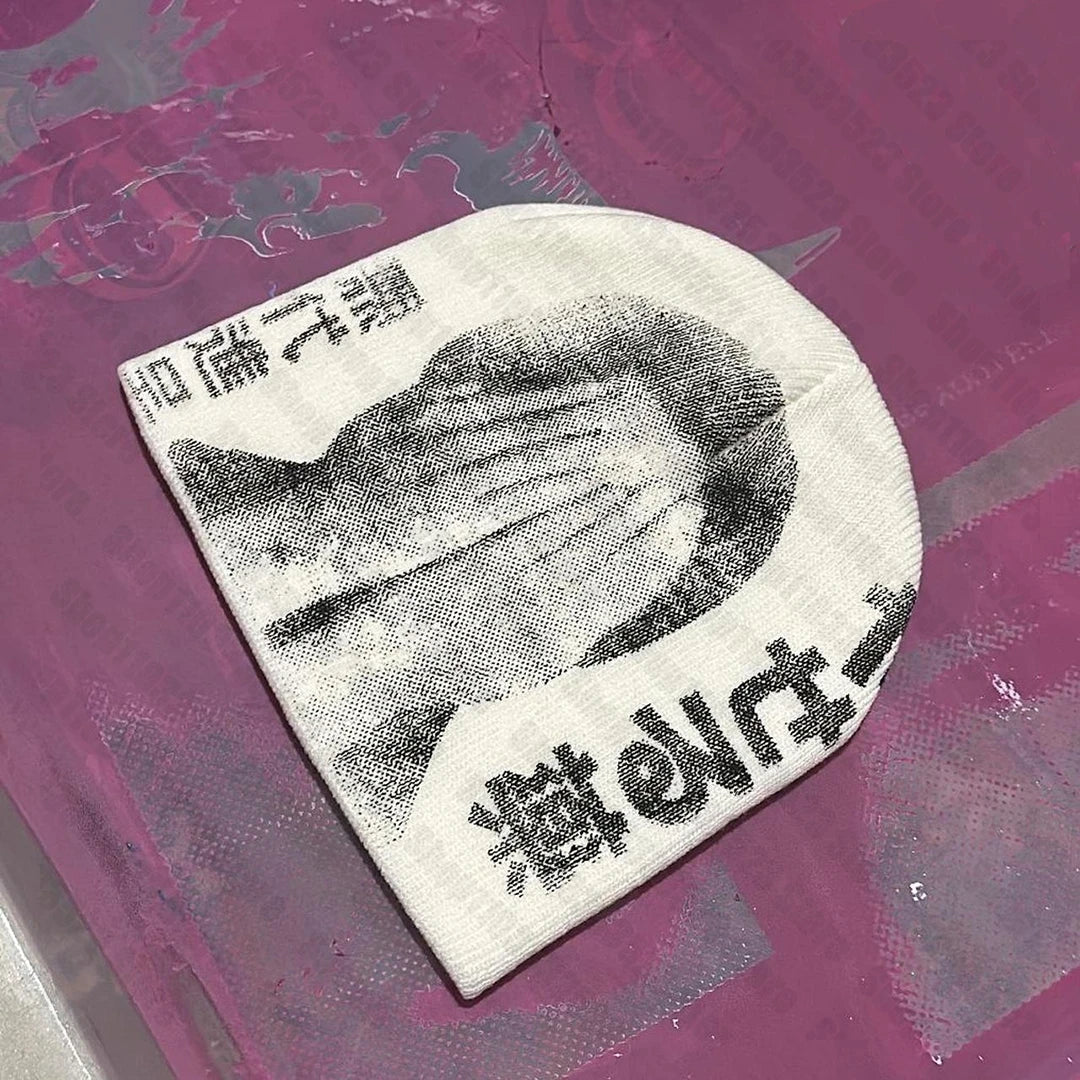 Temple North taps Y2K street graphics for a gallery‑leaning finish. Ribbed in soft bone‑white knit with a charcoal photo print and cryptic text, it stretches for a comfy, slouch‑friendly fit—flip the cuff or wear it loose.