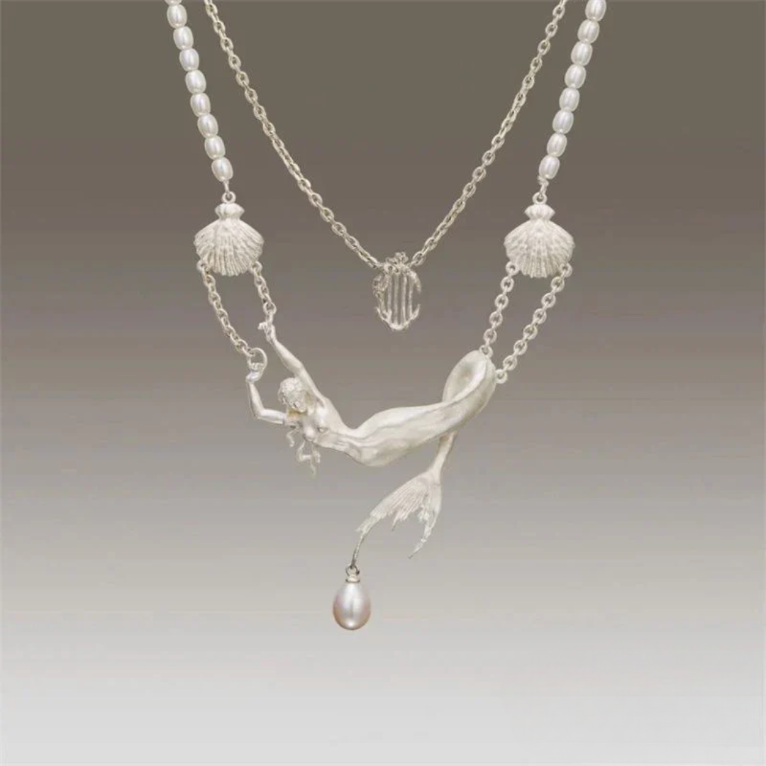 A heritage‑style pendant featuring a sculpted mermaid rising from swirling waves, cast from an archival coastal medallion and hand‑aged for heirloom depth. The medallion hangs from a weighty curb chain that sits just below the collarbone on most, finished with a secure claw clasp.