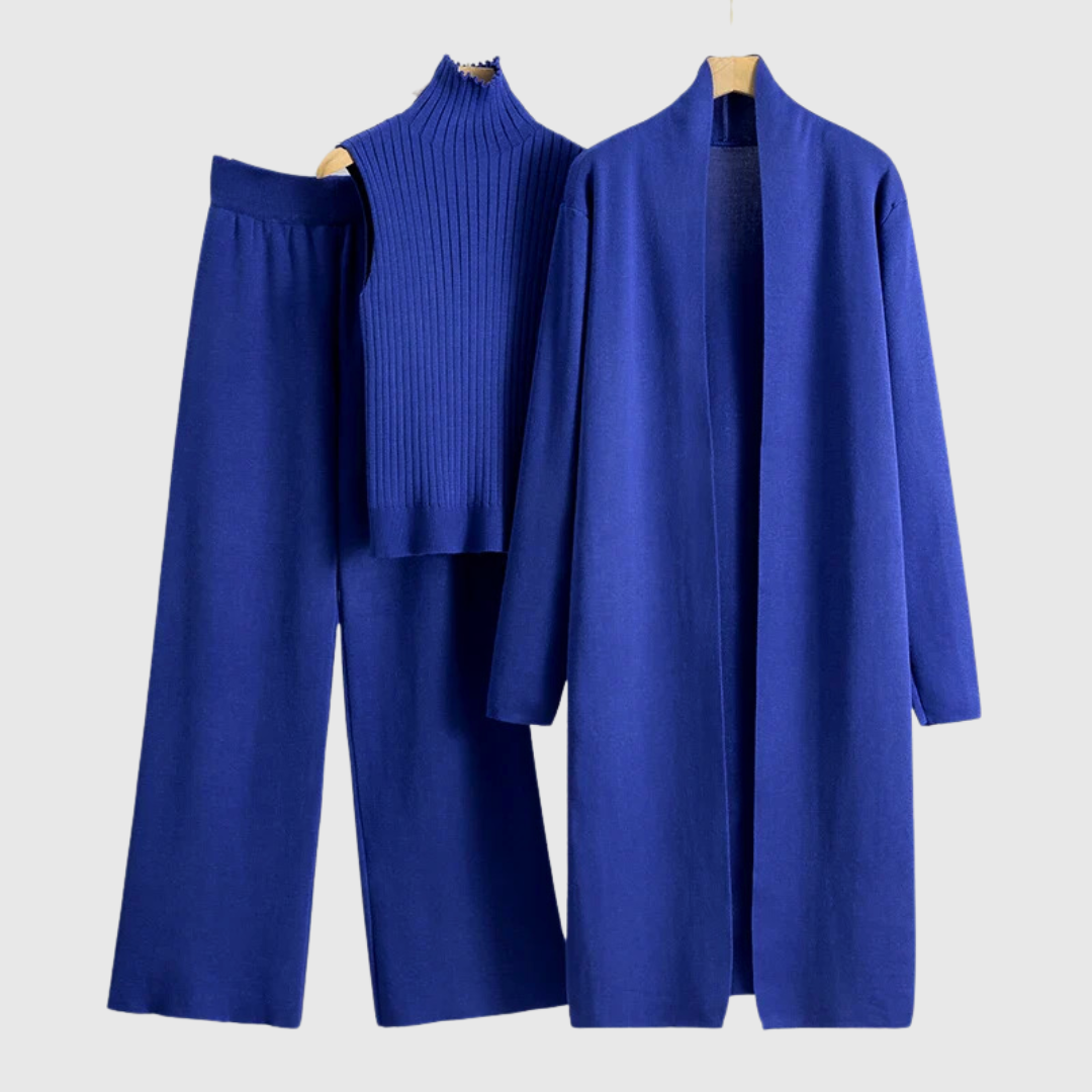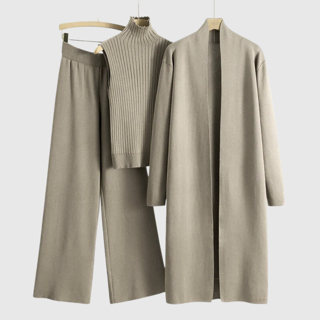 This sophisticated three-piece set offers a complete look for the modern woman who values style and versatility. Each ensemble includes a coordinated top, bottom, and matching outer layer, providing a polished and put-together appearance with minimal effort.