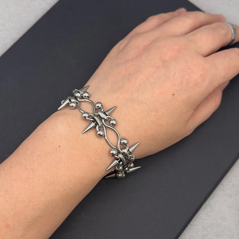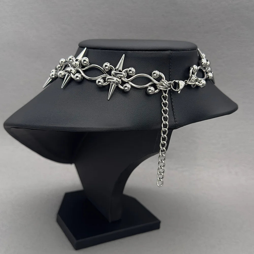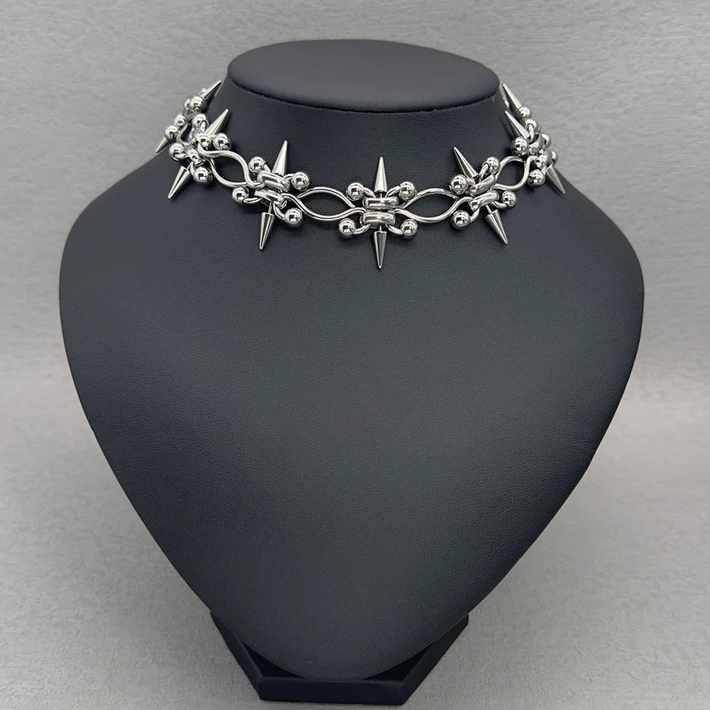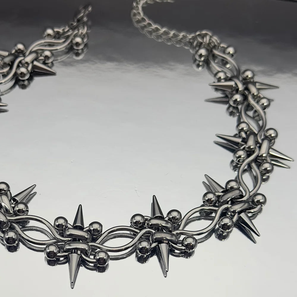 Hand‑cast from surgical‑grade steel, interlocking fleur‑spikes and gothic crosses contour the neck like a miniature suit of armour, polished to a gun‑metal mirror. A draped secondary link lets you cinch the fit so the piece rests just above the collarbone for maximum camera impact.