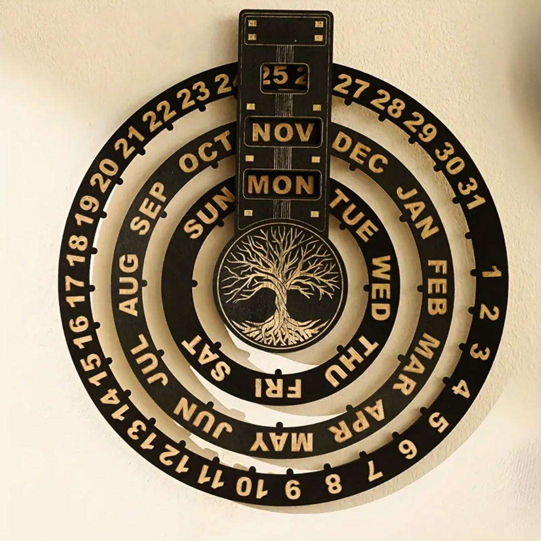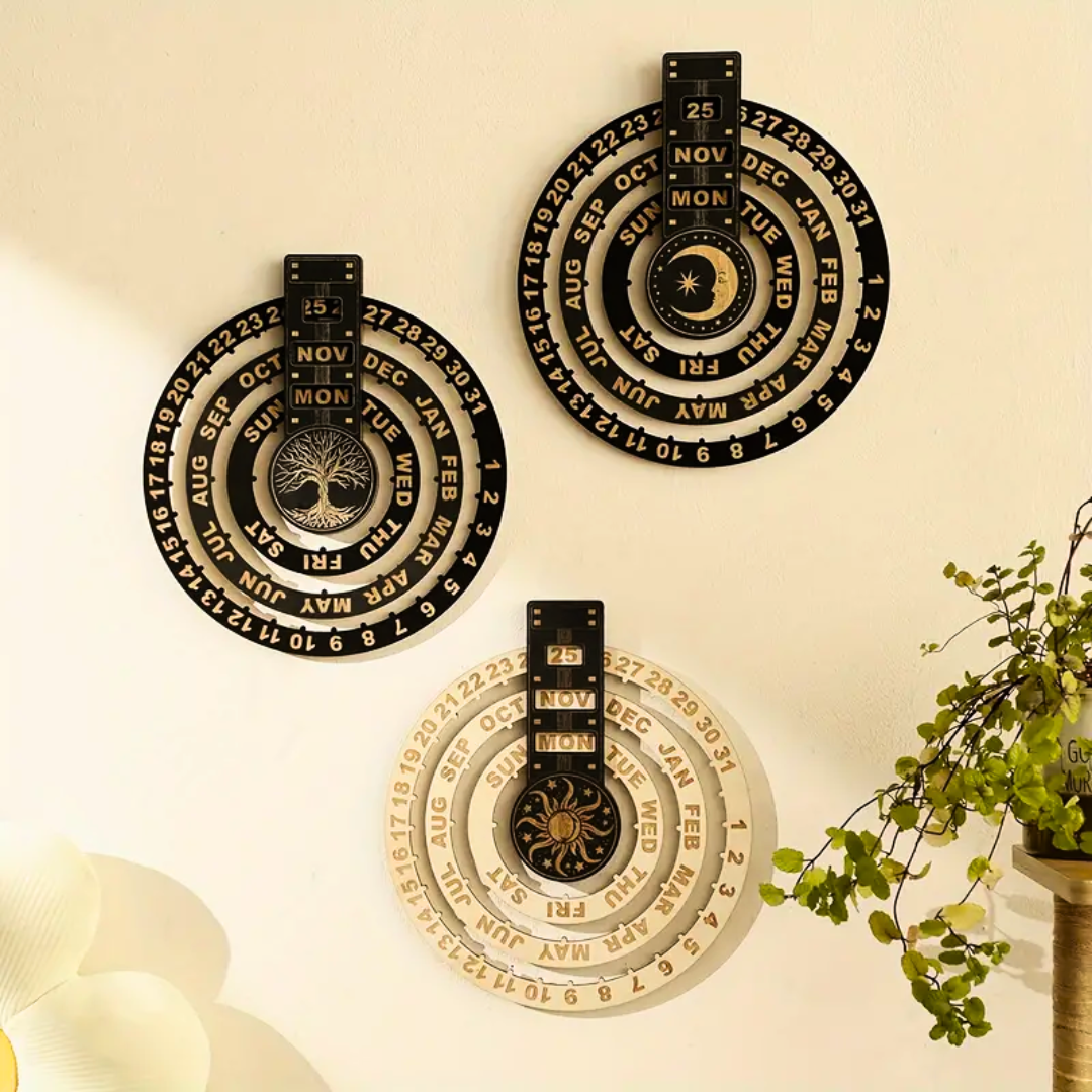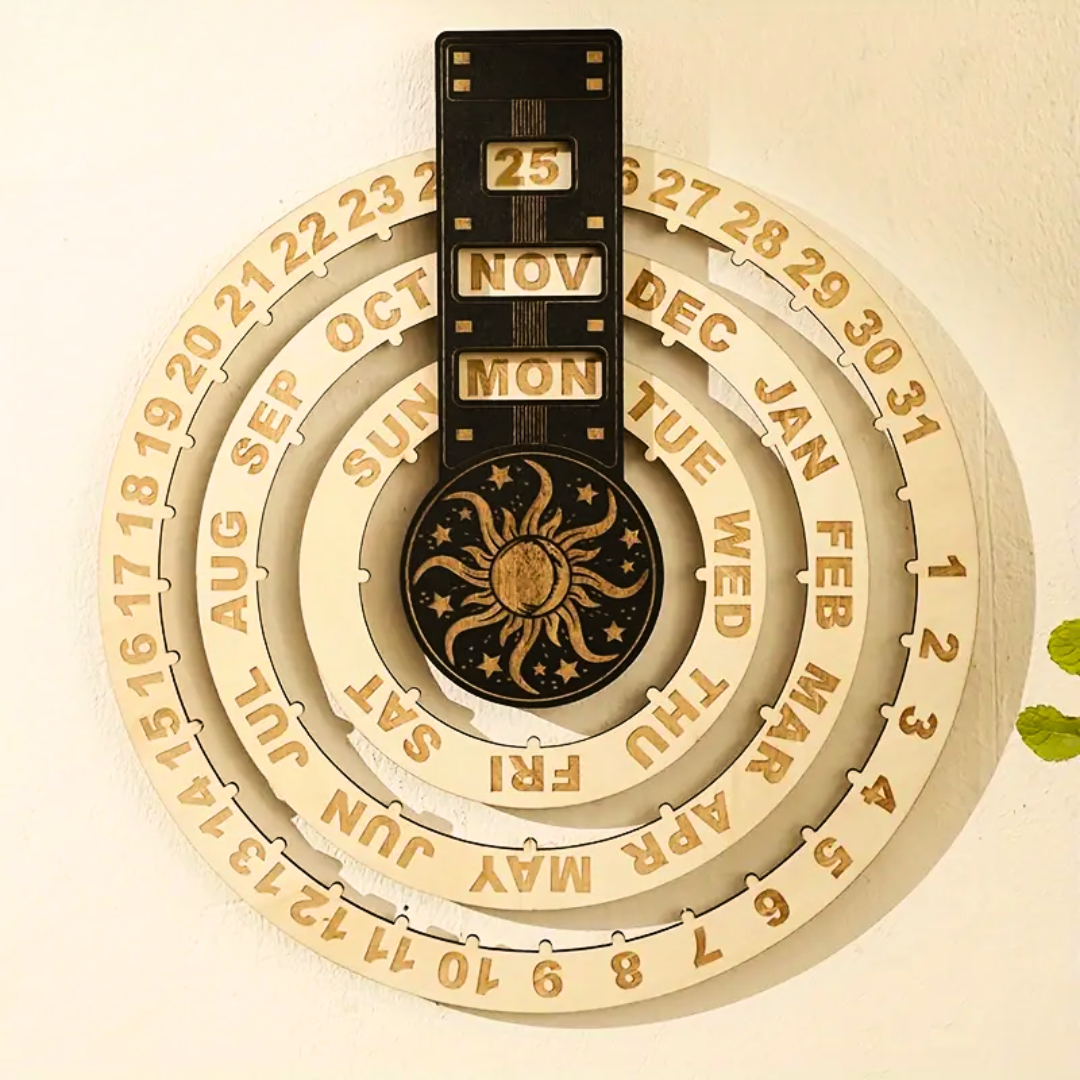 Crafted from natural wood, this decorative calendar features a captivating circular design with rotating elements, allowing you to effortlessly track the date, day, and month. Its versatile design allows for both wall hanging and tabletop display, making it a perfect addition to any home or office decor.