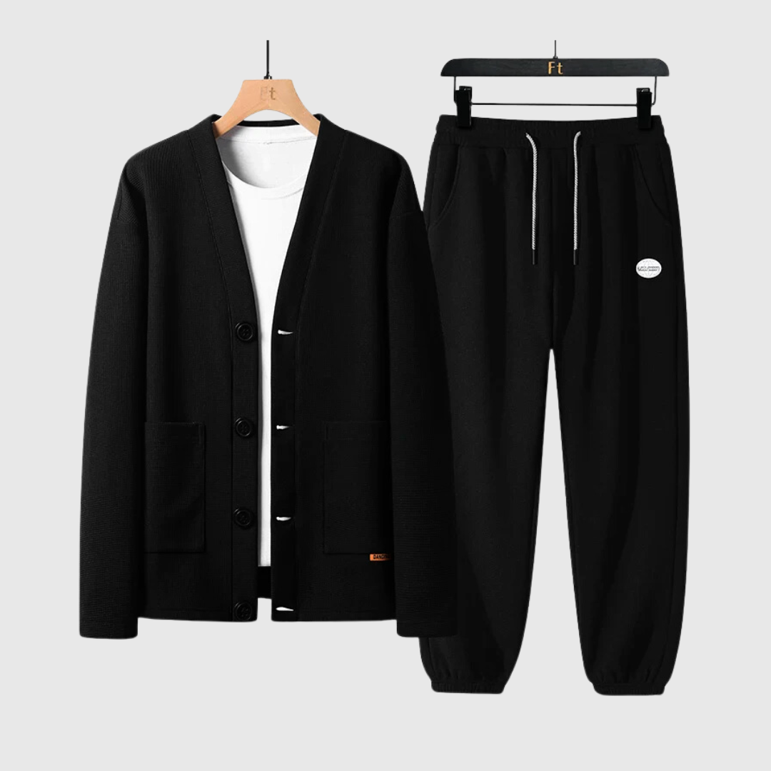 This set combines a cardigan with jogger-style trousers for a seamless transition from work to weekend. The meticulously crafted cardigan boasts a sleek button-up front and functional pockets, while the trousers offer a comfortable, tapered fit with a drawstring waist.
