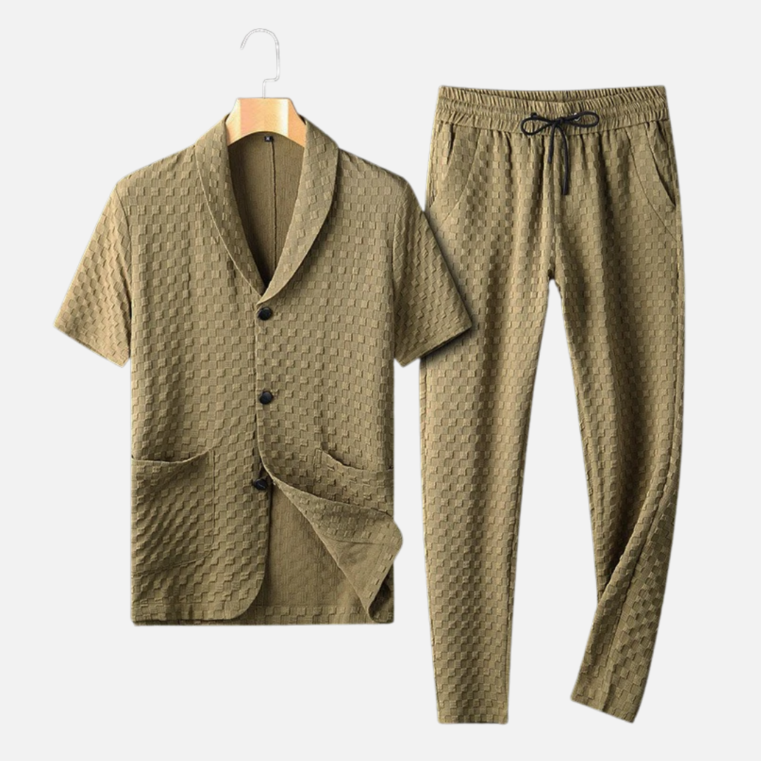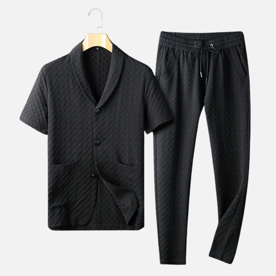 Introducing the Tom Adams set that combines tailoring tradition and exquisite fabrics to create a contemporary look for the garment. An ultra-chic ensemble is created by a long-sleeved jacket with a mandarin collar and two pockets for small essentials paired with a loose-fit sweatpant.