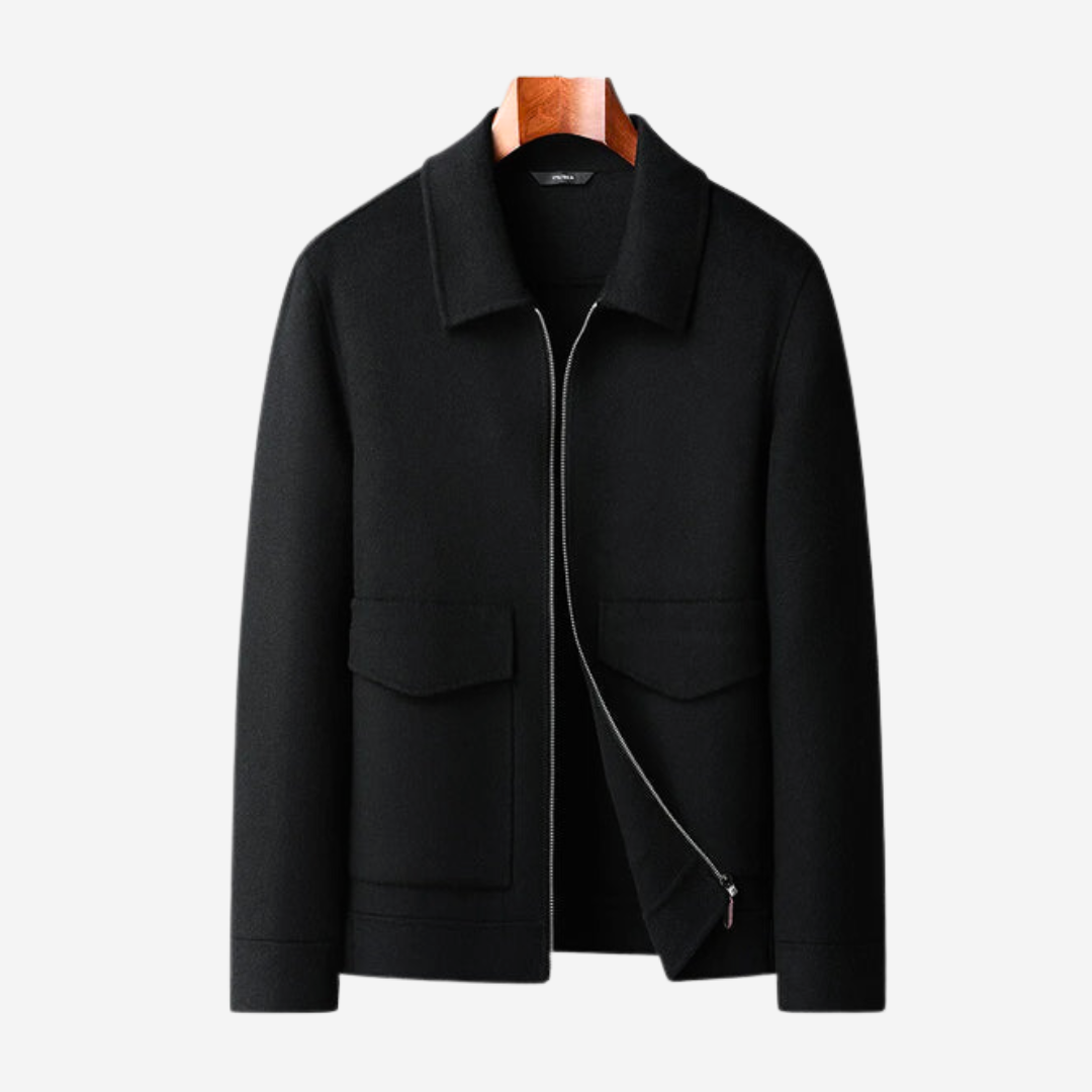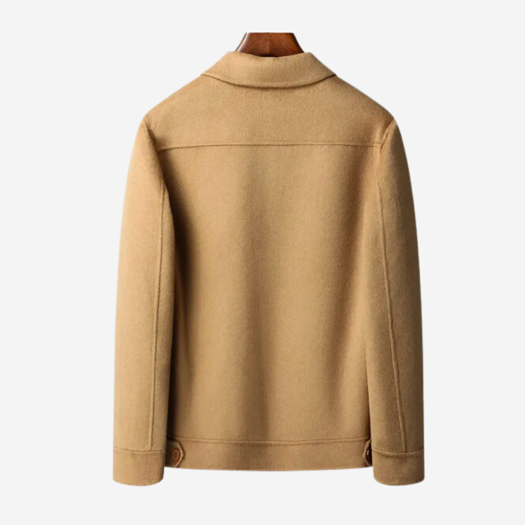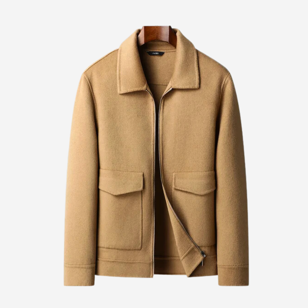 The Tom Adams Wool Jacket, a classic and modern style. This jacket is crafted with a thoughtful blend of materials, featuring 70% wool for unparalleled warmth and durability, complemented by a mix of polyester for added strength and a luxurious cashmere lining for comfort.