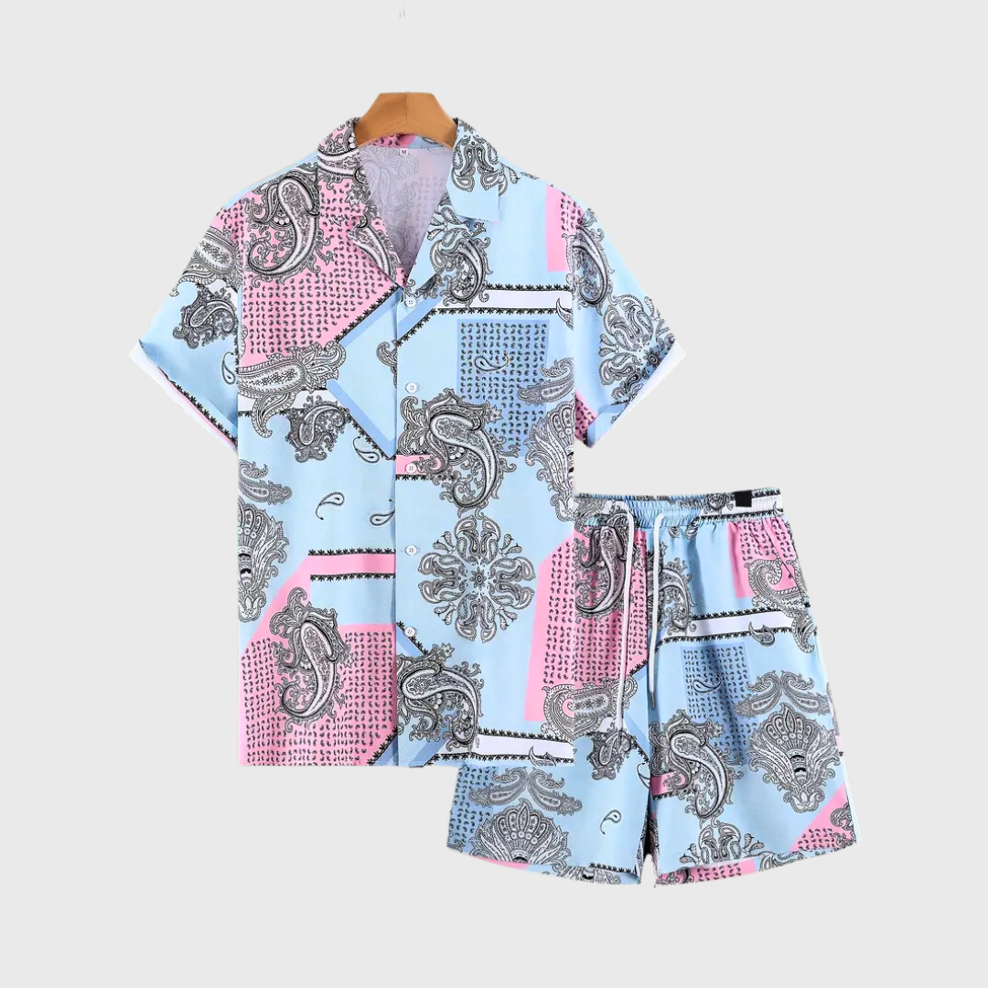 This exquisite ensemble is a testament to craftsmanship, featuring a meticulously designed button-up shirt and matching shorts, each adorned with a tapestry of intricate geometric and floral motifs.