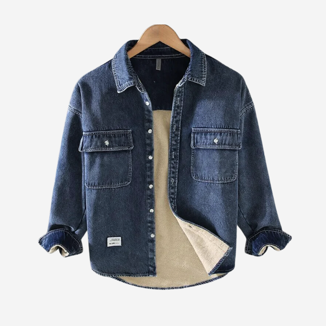 The Tom Carter Fleeced Denim Shirt, crafted from pure cotton, features a cozy fleeced interior and a neat button closure, complemented by a versatile foldable collar.