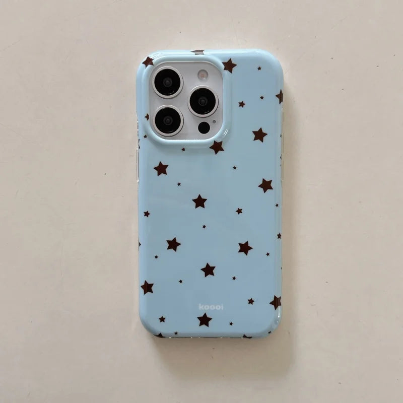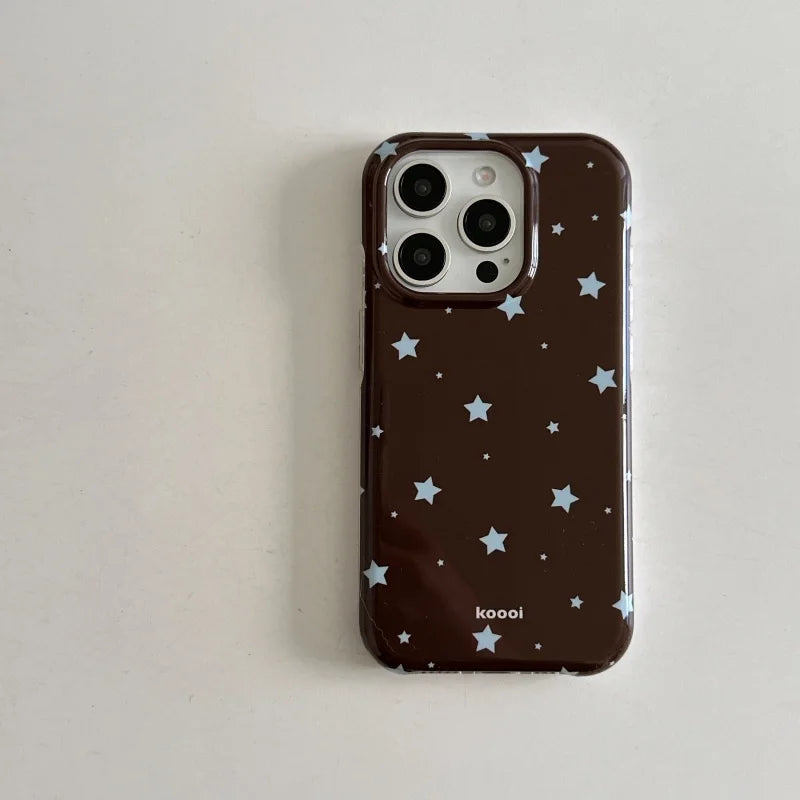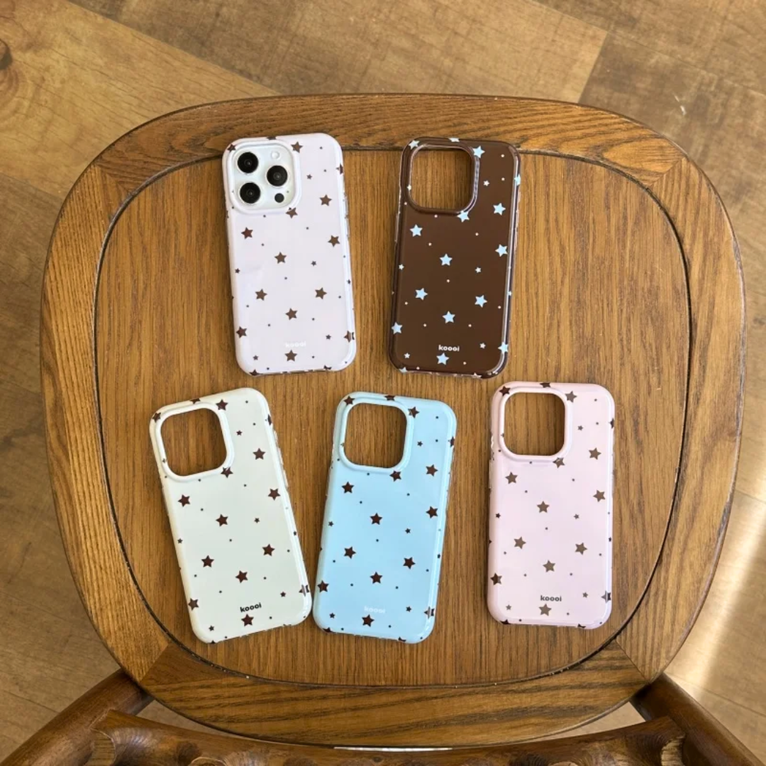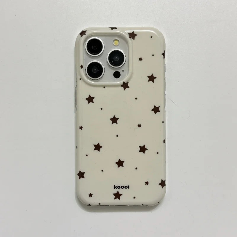 Tiny speckled stars scatter across a soft-touch shell in pastel and cocoa tones, wrapping your phone in a playful pattern that looks cute in mirror selfies and flat lays. Underneath, a dual-layer IMD build fuses the print into the case, keeping the colors crisp while a slim bumper hugs the edges for everyday drops.