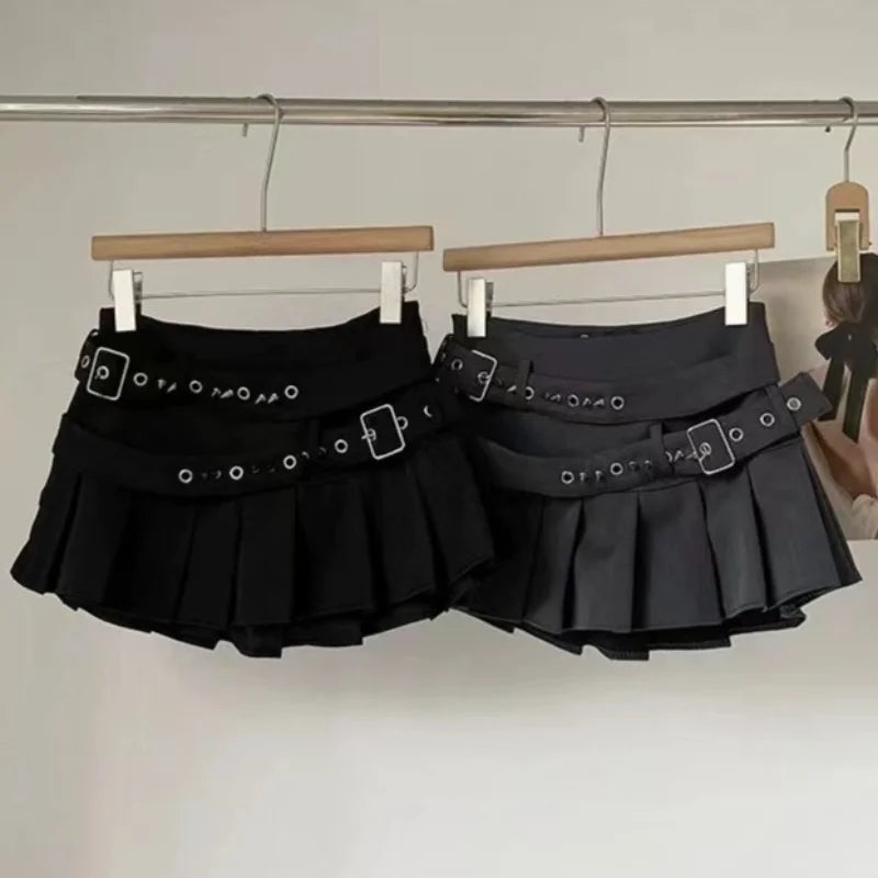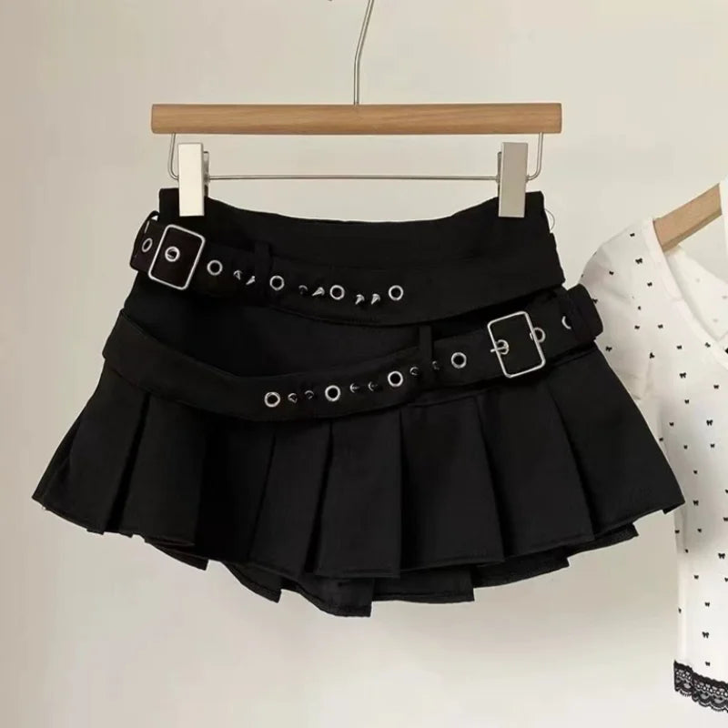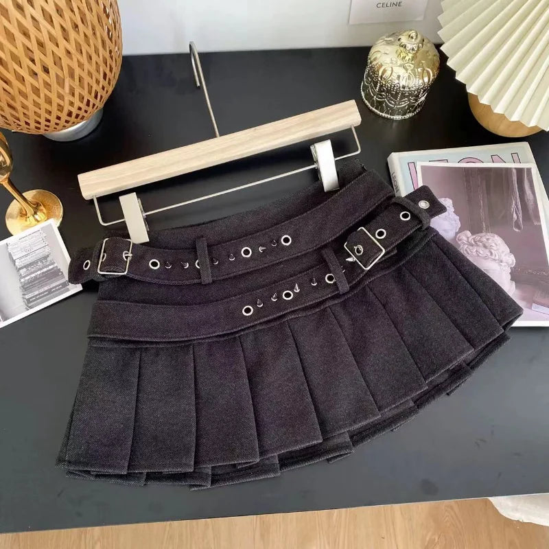 A sleek high waist meets bold, layered belt details for a striking twist on the classic pleated mini. Whether you’re styling it with sneakers for daytime cool or heels for late-night allure, this piece seamlessly fuses Y2K edginess with modern versatility.