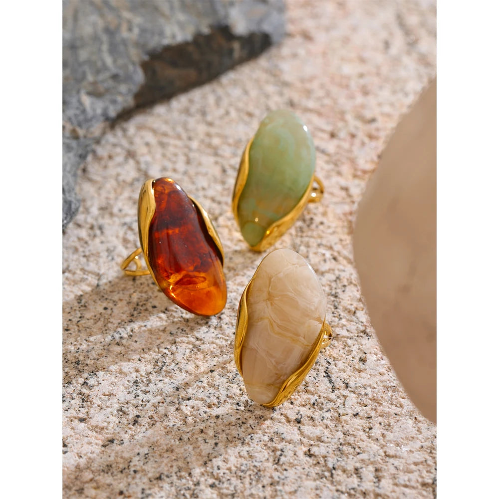 Hand‑poured resin in sea‑foam jade, dune ivory, or cognac amber is framed by a molten gold bezel that melts into an adjustable stainless shank—no green fingers, just gallery‑level glow. Each organic silhouette is one‑of‑a‑kind, catching sunlight (and camera flash) like polished sea glass.
