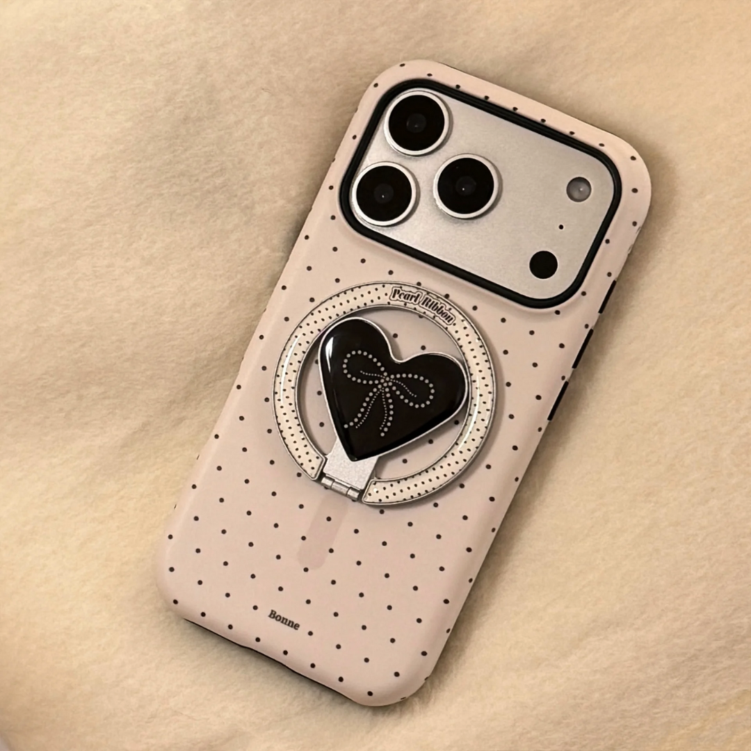 A polished heart cameo sits on a smooth satin shell, flipping out into a slim desk stand and folding back down to look like a little piece of jewelry on your phone. The soft micro-dot panel keeps it from slipping in your hand while the magnetic ring grips mounts and chargers without adding bulky thickness.