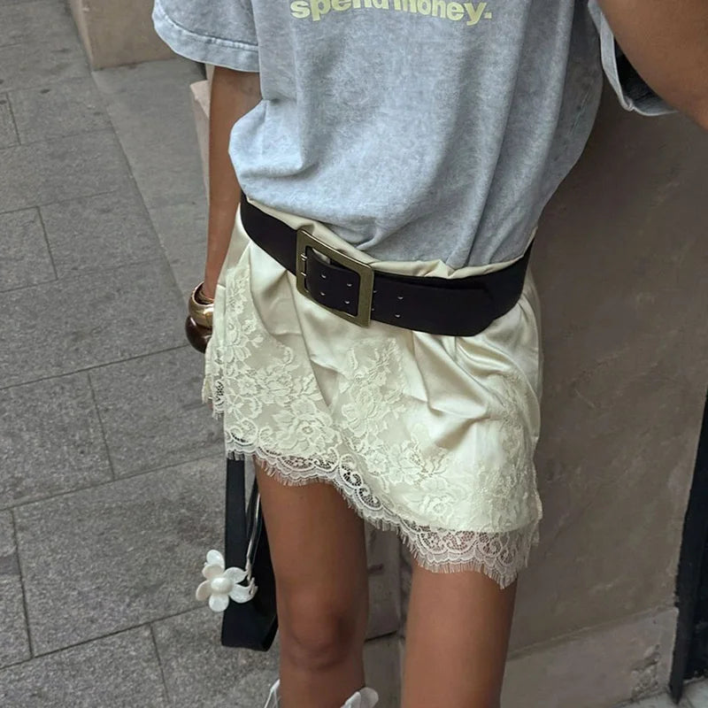 Valmont reworks the slip skirt into a leg‑lengthening mini. Cut from fluid satin with a soft sheen, it sits high on the waist and finishes with a delicate lace hem for a lingerie‑inspired edge—easy with a tee by day or a cami after dark.
