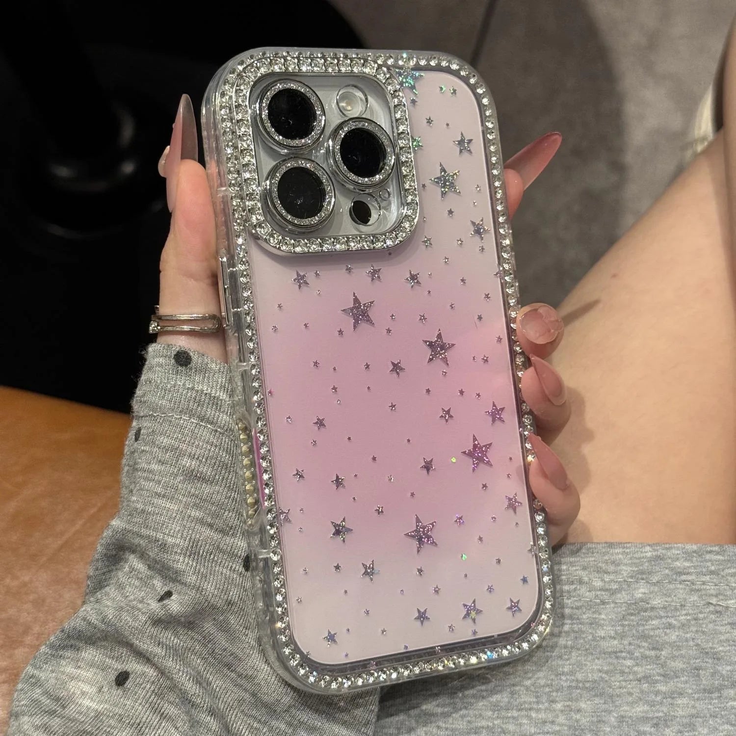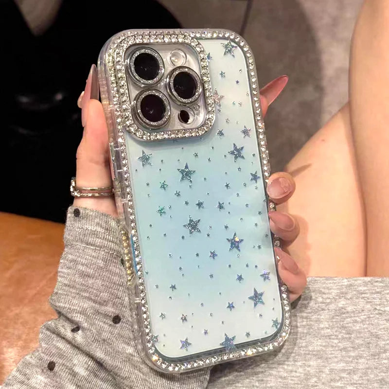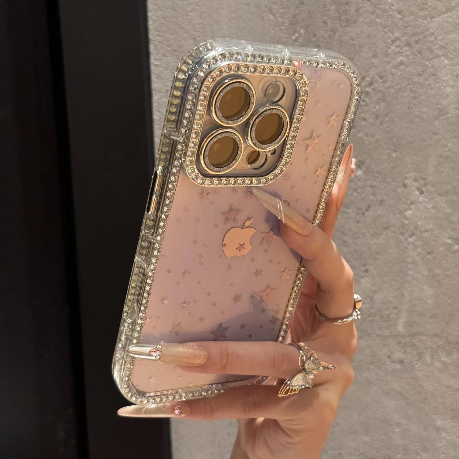 Micro‑pavé crystal rims light up both screen and camera, while a silky gradient shell fades from dusk to starlight beneath floating foil constellations. The flexible core cushions drops yet keeps MagSafe snap instant, turning every mirror flick into a red‑carpet flash.