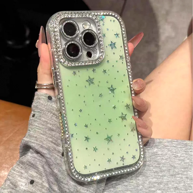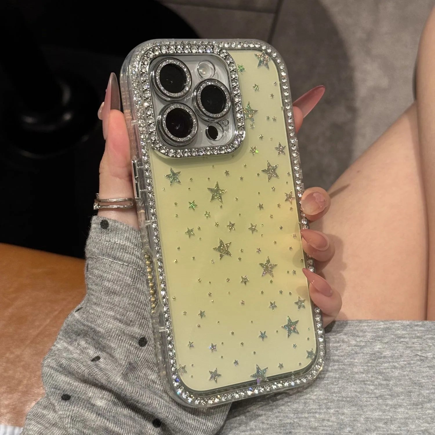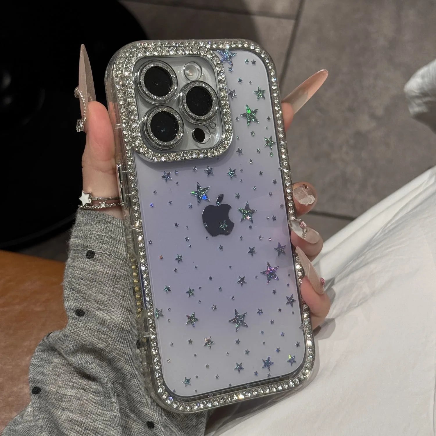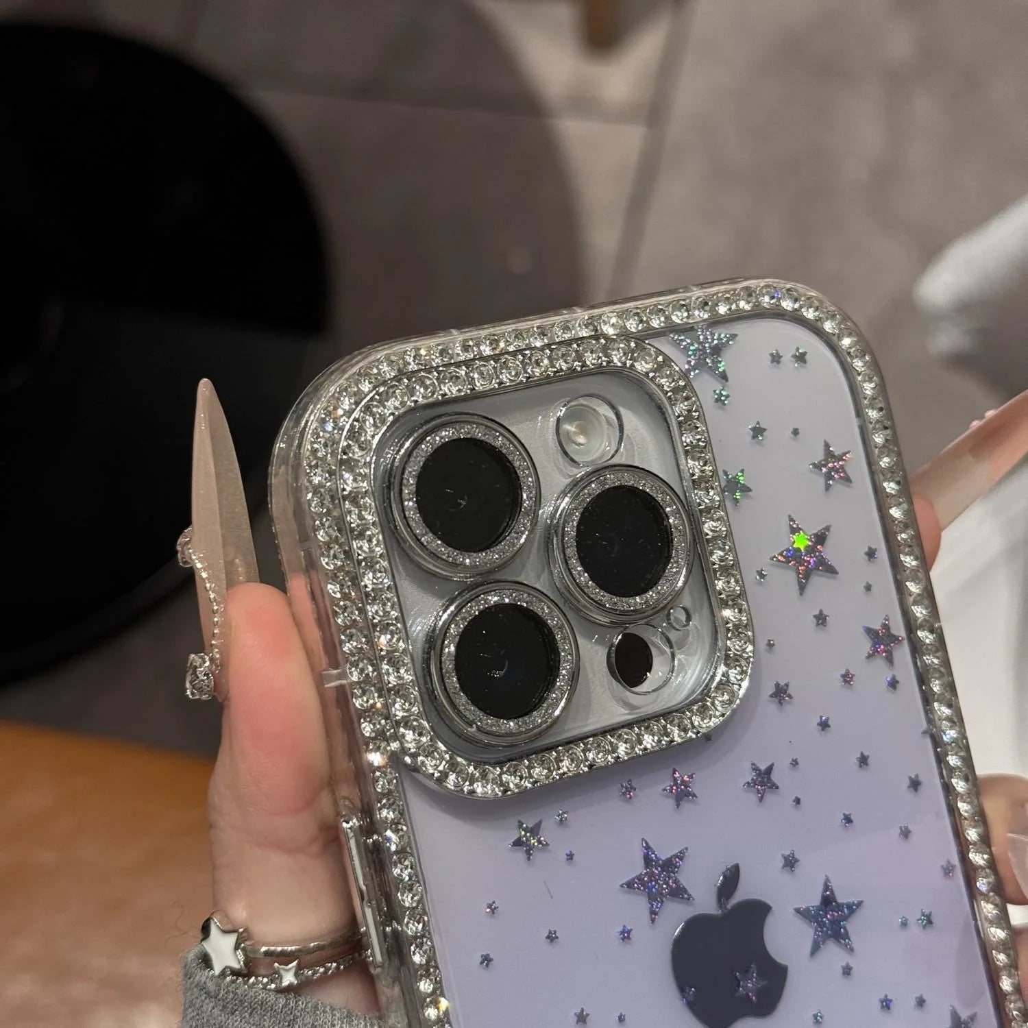 Micro‑pavé crystal rims light up both screen and camera, while a silky gradient shell fades from dusk to starlight beneath floating foil constellations. The flexible core cushions drops yet keeps MagSafe snap instant, turning every mirror flick into a red‑carpet flash.