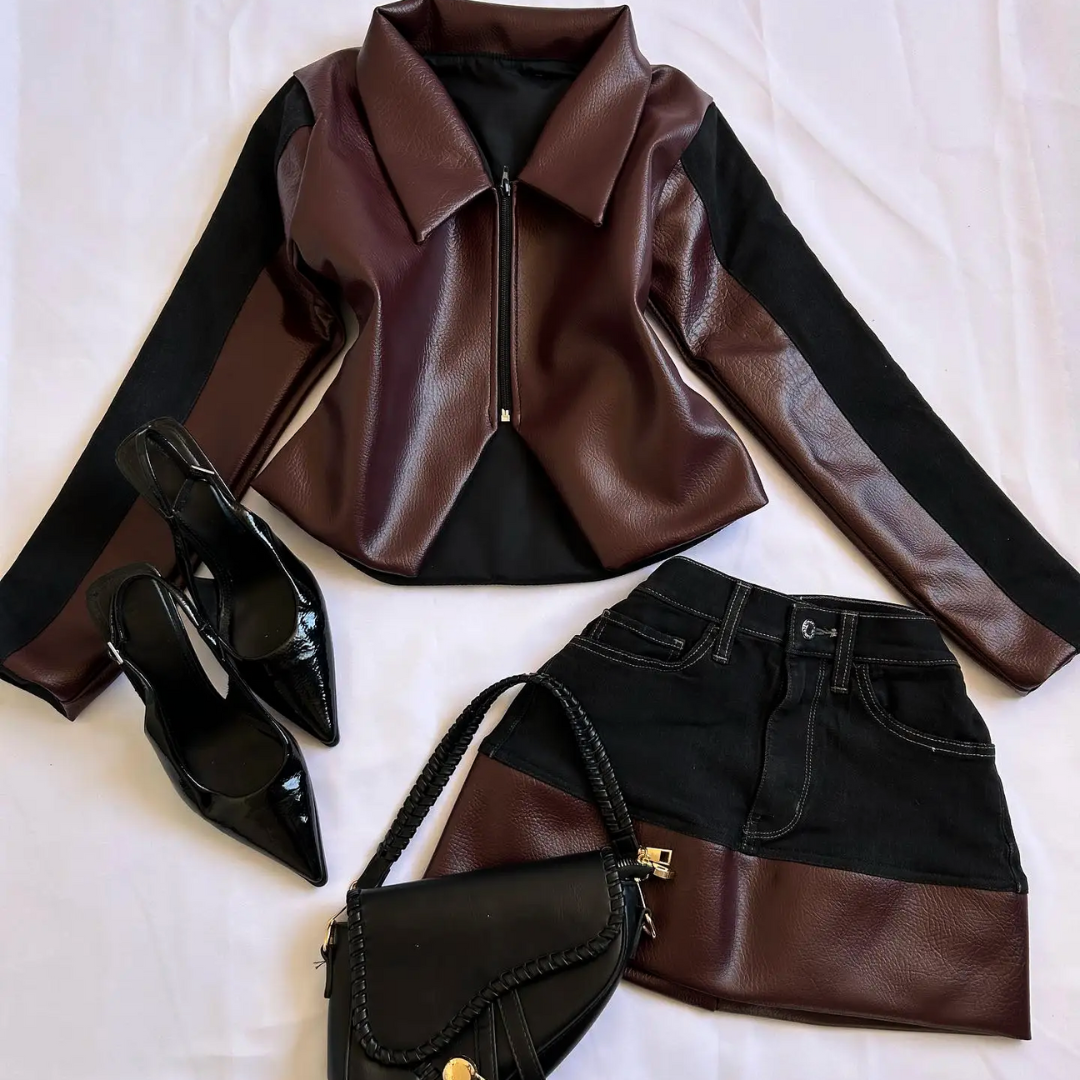 A sharp Y2K revival, the Varenne Splice Set pairs a cropped, zip‑front jacket in Bordeaux and Onyx panels with a matching denim‑and‑faux‑leather mini that mirrors the two‑tone cut. Clean lines, high contrast, and a tailored fit turn any sidewalk into a set‑piece.