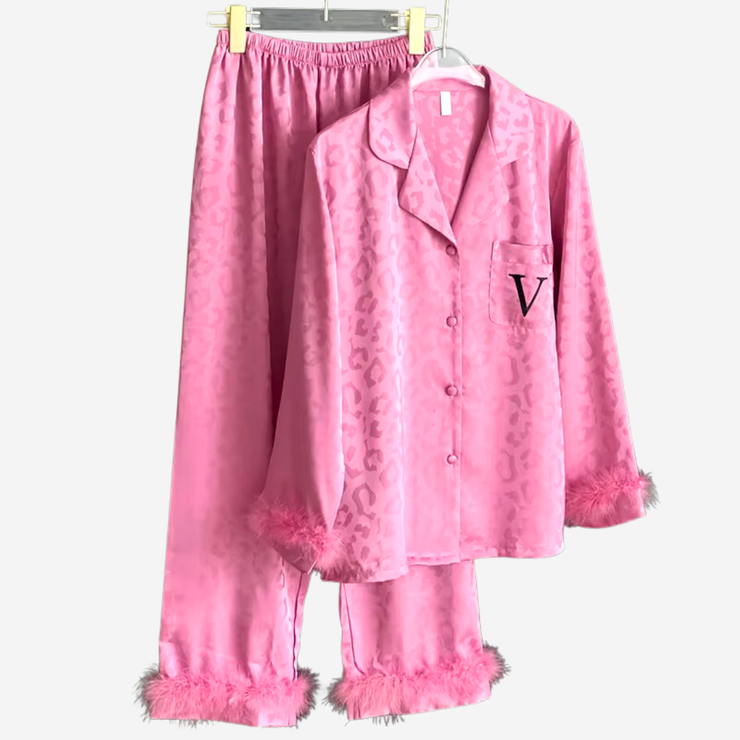 Drift off to dreamland in luxurious comfort with The Velvetine Slumber Set. This exquisite pajama set is crafted from a silky-soft blend of polyester and rayon, enveloping you in a cloud of comfort. With its elegant design, playful feather trim, and personalized touch, this set redefines bedtime chic.