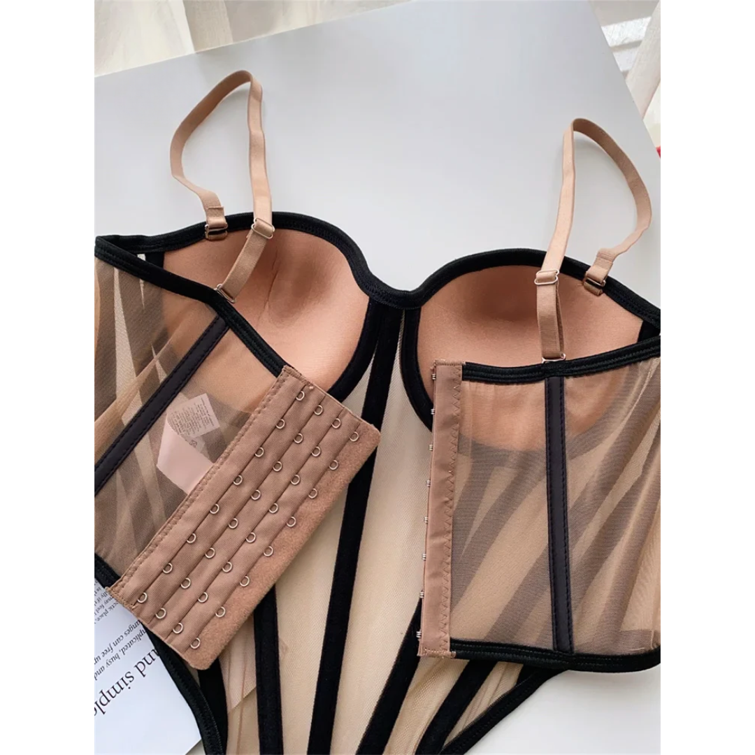 Ignite your style with an exquisitely crafted sheer corset, combining fine mesh and bold striped boning. Underwired cups sculpt a flawless silhouette, while the backless design and adjustable straps deliver a perfect, custom fit.