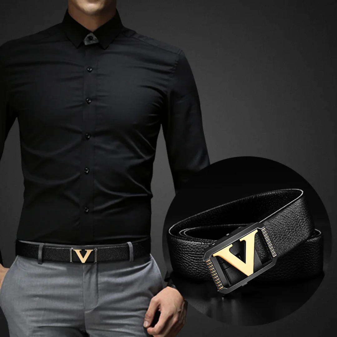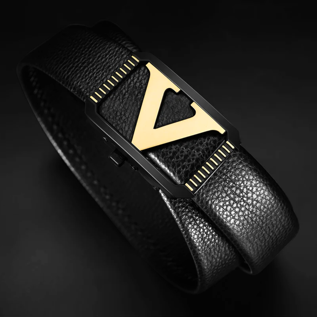 The Vercade Belt fuses a striking, triangular, black-and-gold buckle with full-grain leather, creating a statement piece that transcends occasion for the discerning gentleman seeking timeless luxury.
